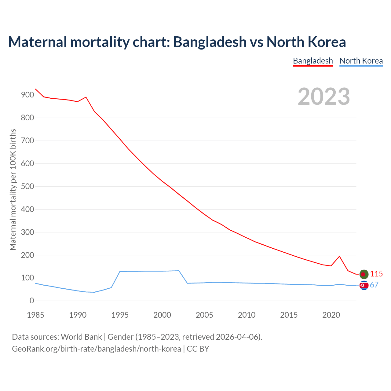 The maternal mortality rate, which is the probability of dying during childbirth or within 42 days of pregnancy termination, is 115 deaths per 100,000 live births in Bangladesh, compared to 67 deaths in North Korea.