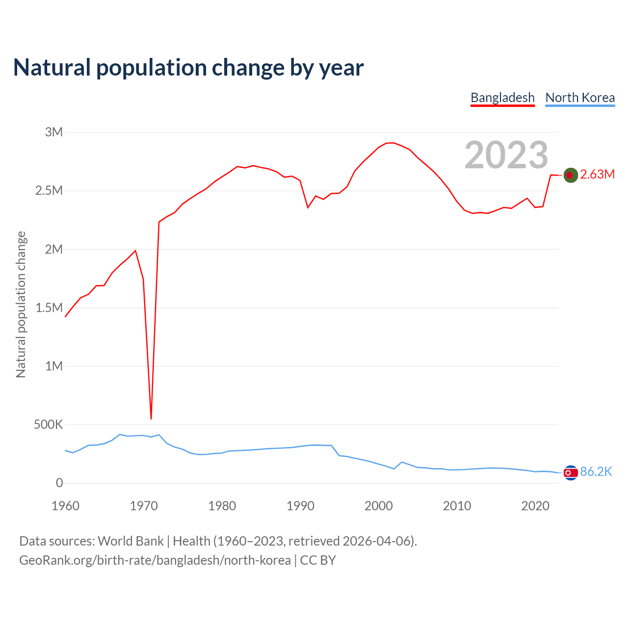 Bangladesh has an annual birth rate of 20.4 births per 1,000 people, compared to 12.9 for North Korea. The average number of children a woman is expected to have during her lifetime — the fertility rate, is 2.16 in Bangladesh and 1.78 in North Korea — 17.7% difference.