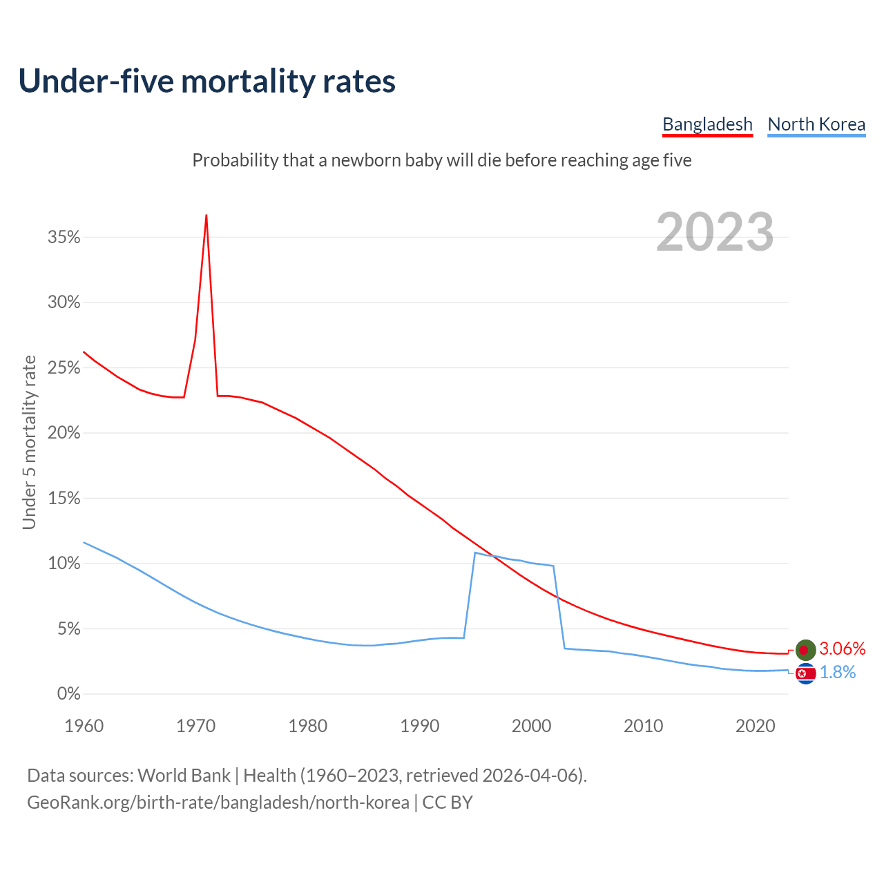 The chance that a newborn baby will die before reaching age five is 3.06% in Bangladesh and 1.8% in North Korea. Above is a chart with historical data on under-five mortality rates.