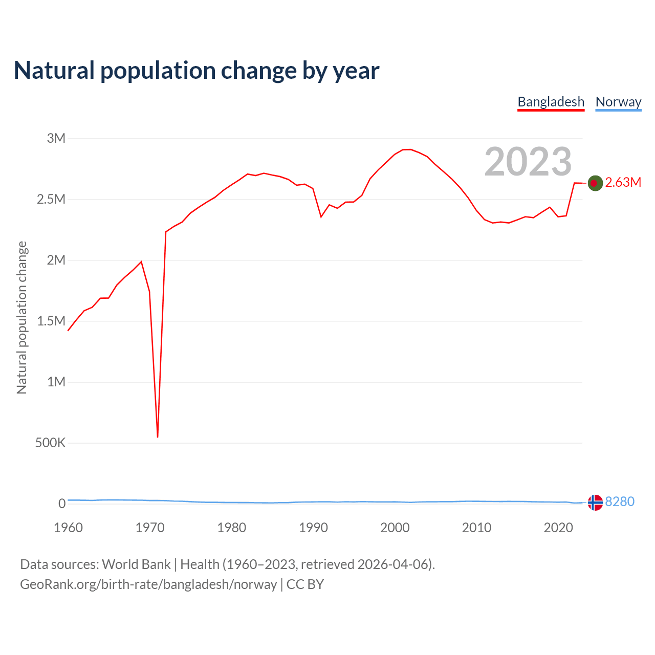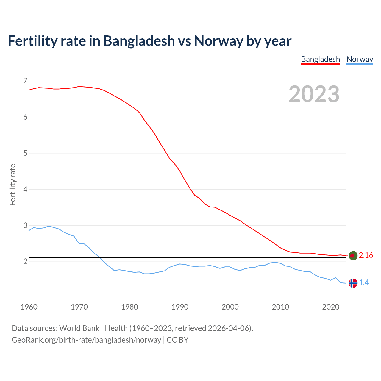 According to the latest available data on birth rates, the fertility rate in Bangladesh was 2.16 children per woman in 2023, compared to 1.4 in Norway in 2023. The replacement level is considered to be 2.1 children per woman.