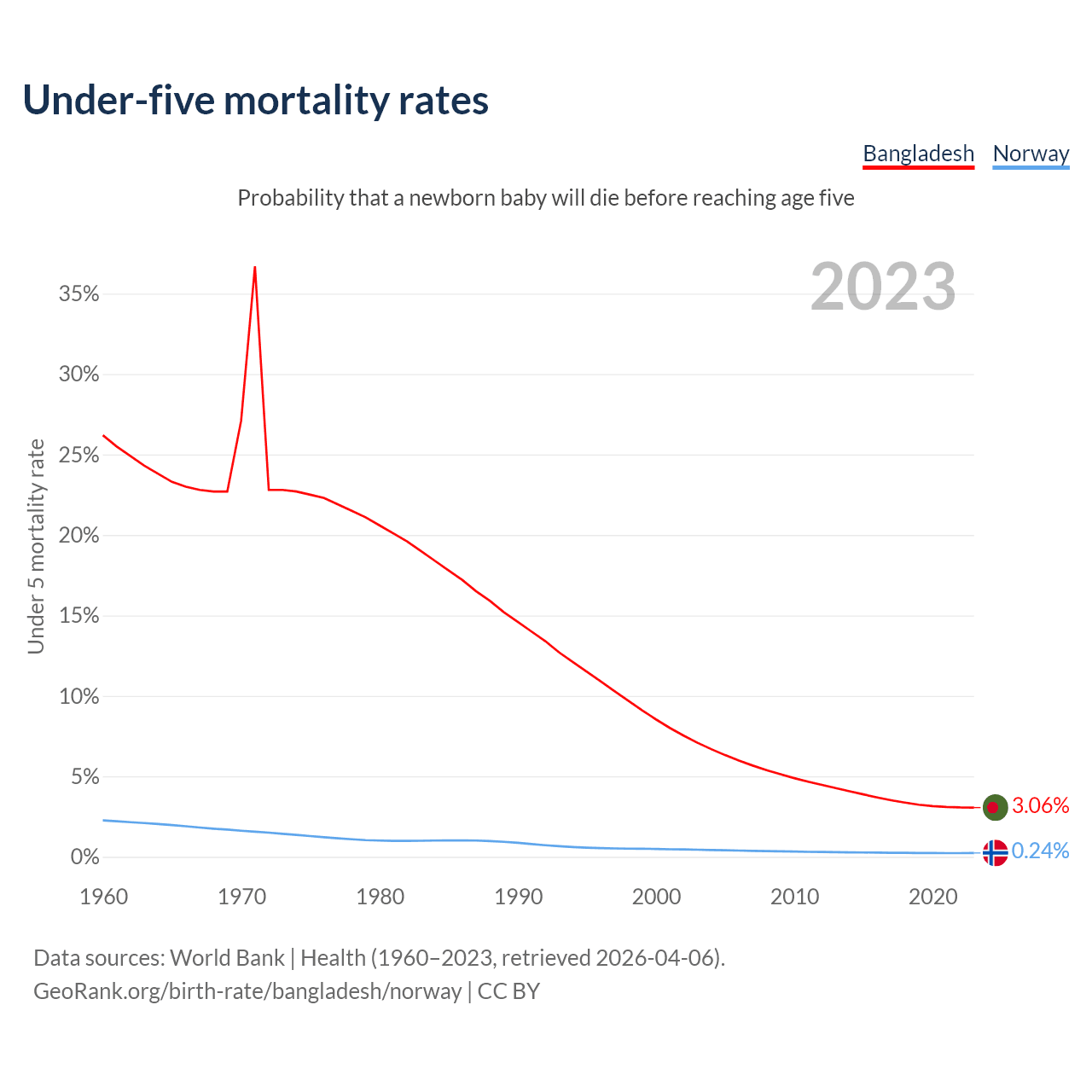 The chance that a newborn baby will die before reaching age five is 3.06% in Bangladesh and 0.24% in Norway. Above is a chart with historical data on under-five mortality rates.