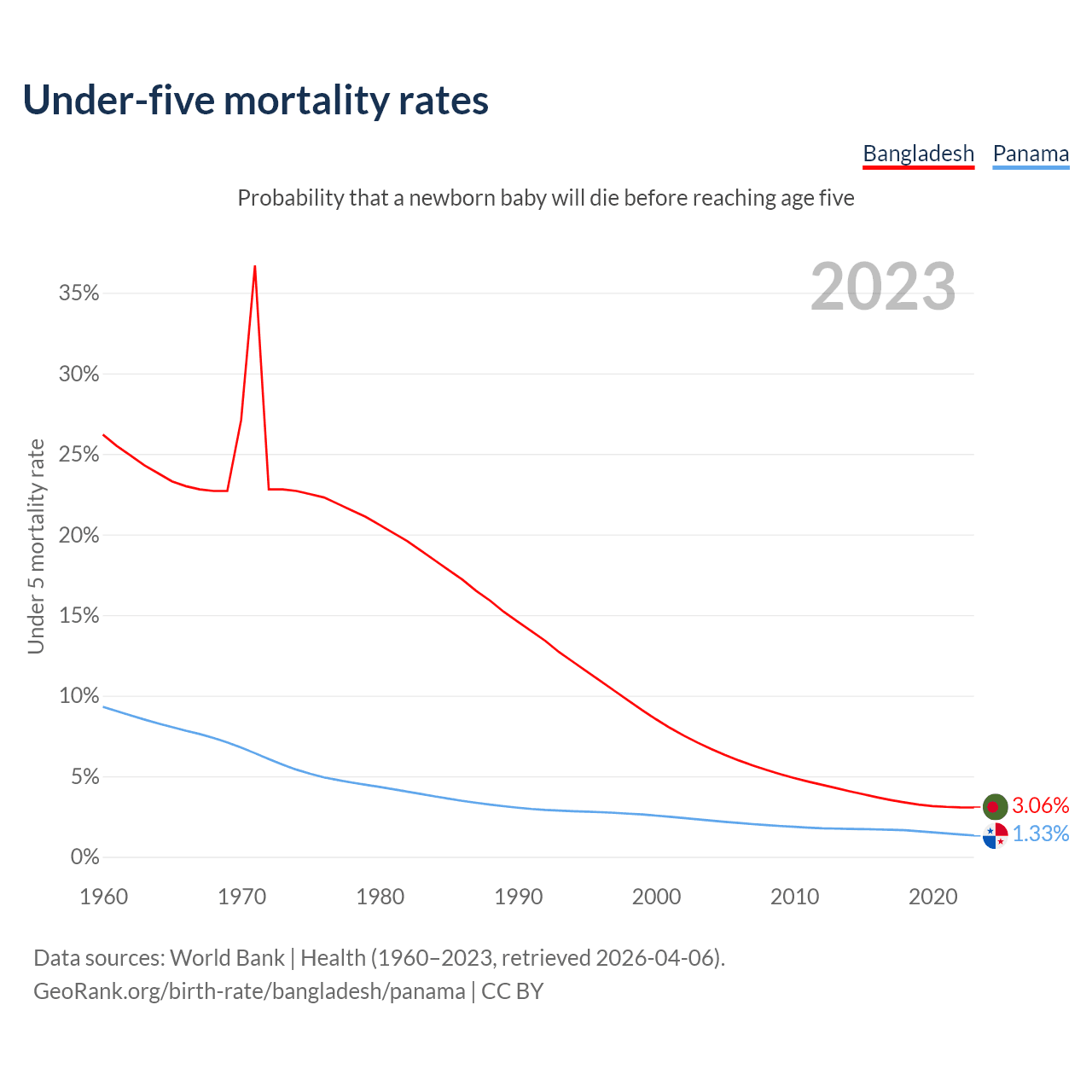 The chance that a newborn baby will die before reaching age five is 3.06% in Bangladesh and 1.33% in Panama. Above is a chart with historical data on under-five mortality rates.