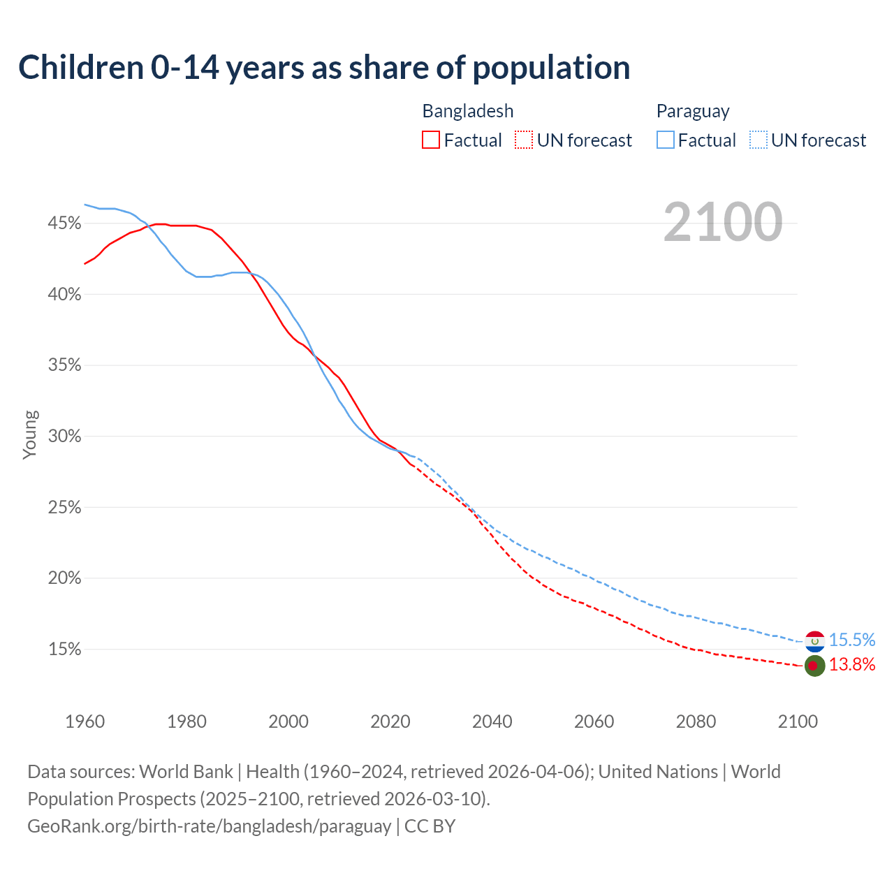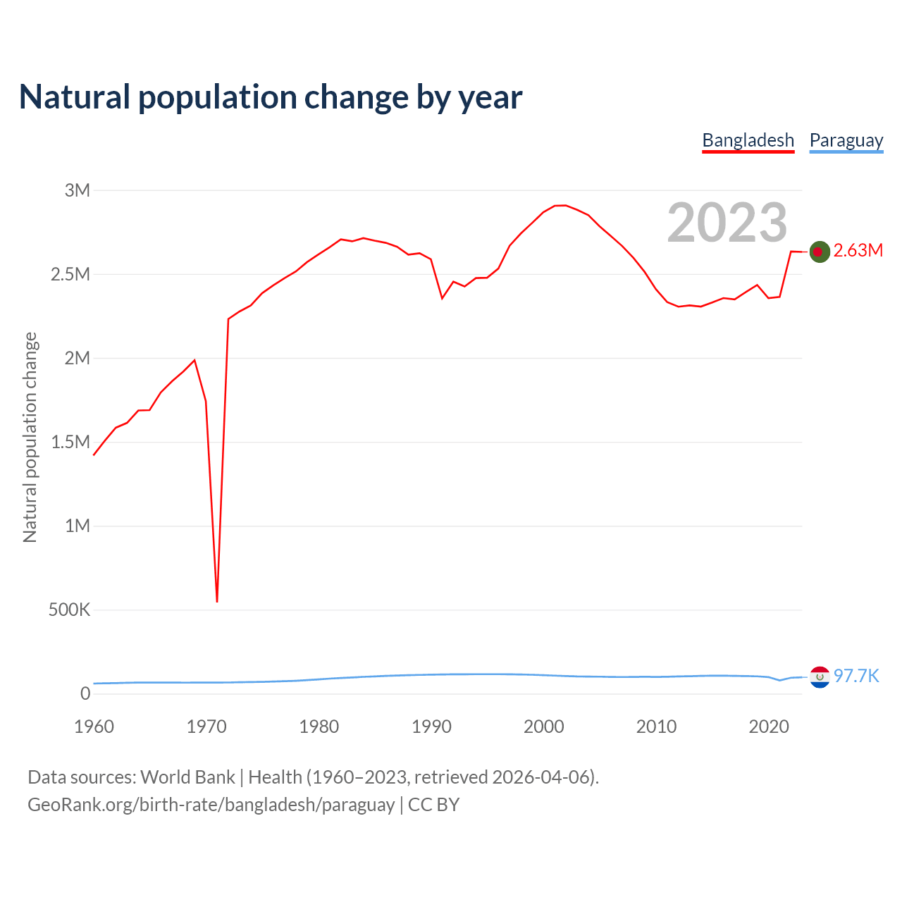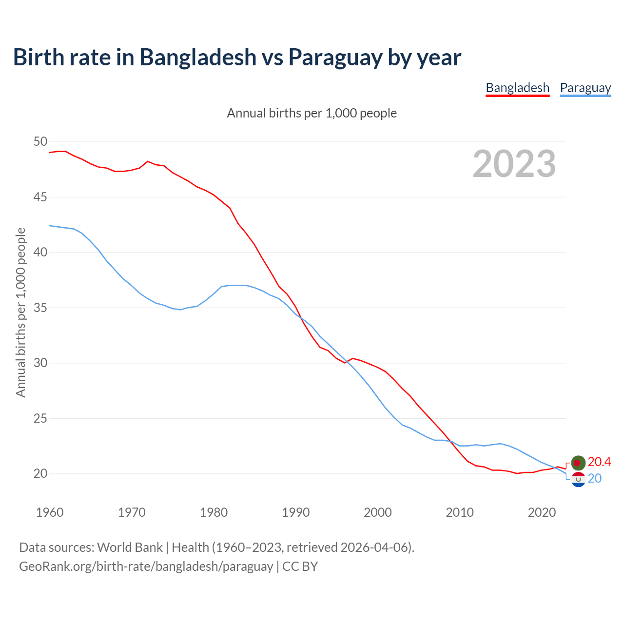 According to the latest available data on birth rates, the fertility rate in Bangladesh was 2.16 children per woman in 2023, compared to 2.42 in Paraguay in 2023. The replacement level is considered to be 2.1 children per woman.
