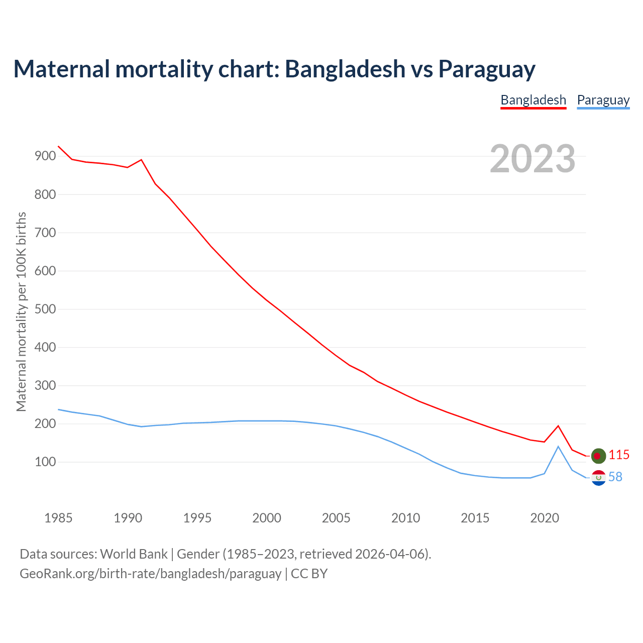 The maternal mortality rate, which is the probability of dying during childbirth or within 42 days of pregnancy termination, is 115 deaths per 100,000 live births in Bangladesh, compared to 58 deaths in Paraguay.