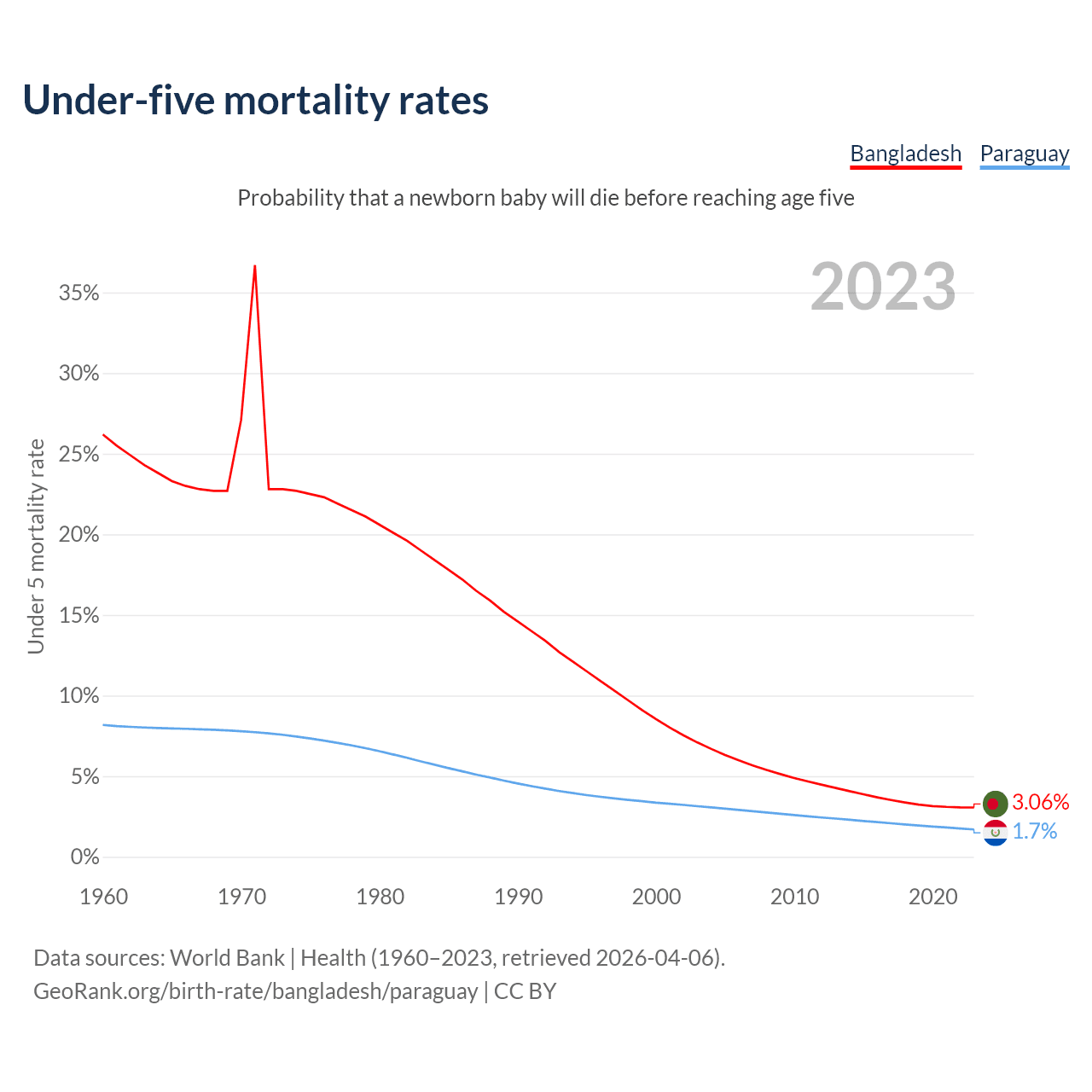 The chance that a newborn baby will die before reaching age five is 3.06% in Bangladesh and 1.7% in Paraguay. Above is a chart with historical data on under-five mortality rates.