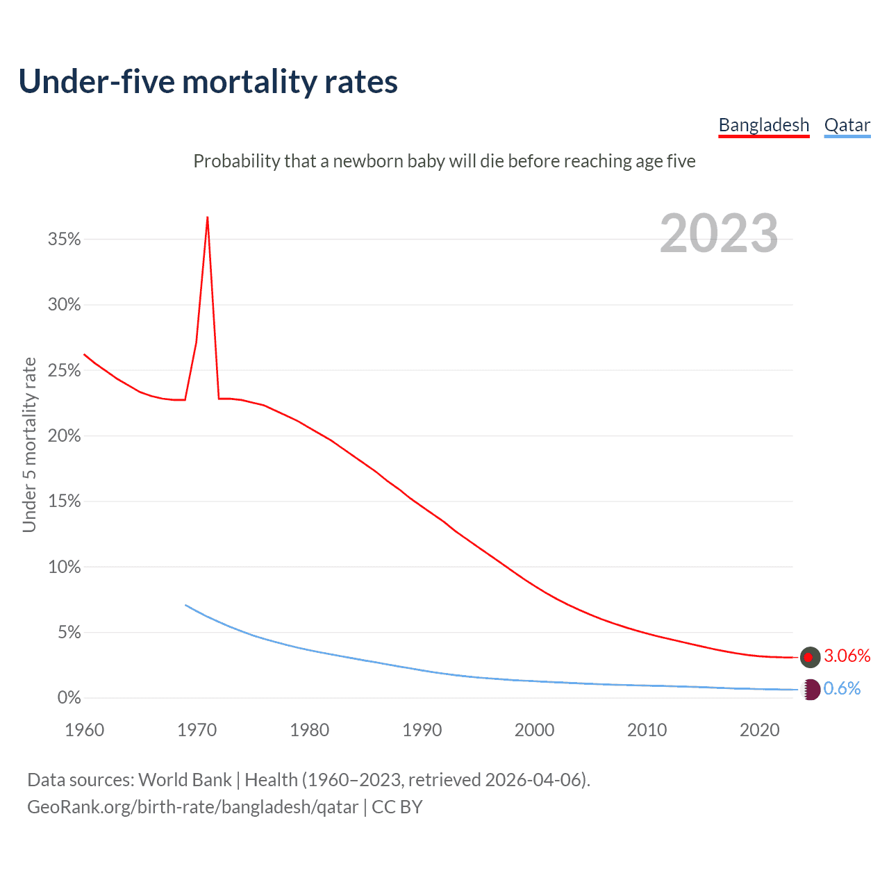 The chance that a newborn baby will die before reaching age five is 3.06% in Bangladesh and 0.6% in Qatar. Above is a chart with historical data on under-five mortality rates.