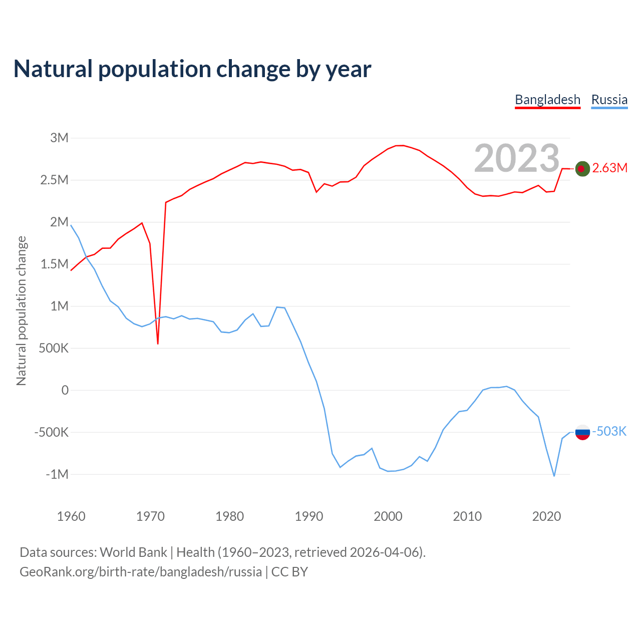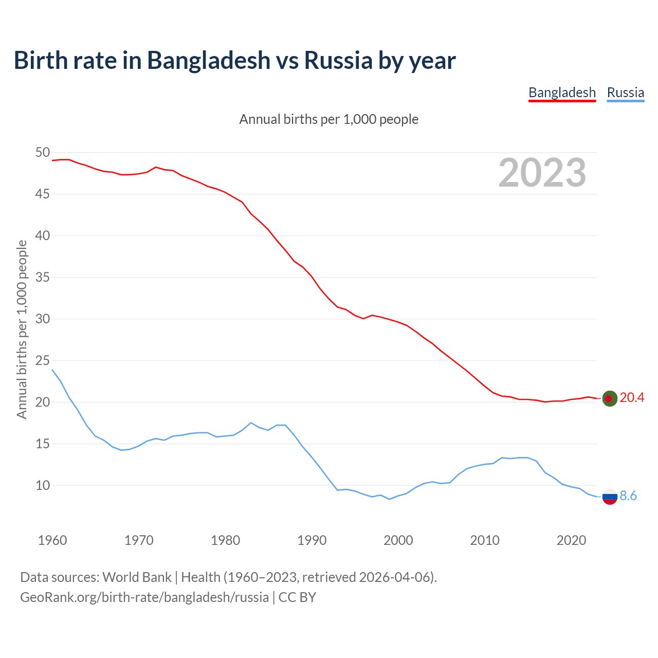 Bangladesh has an annual birth rate of 20.4 births per 1,000 people, compared to 8.6 for Russia. The average number of children a woman is expected to have during her lifetime — the fertility rate, is 2.16 in Bangladesh and 1.41 in Russia — 34.8% difference.