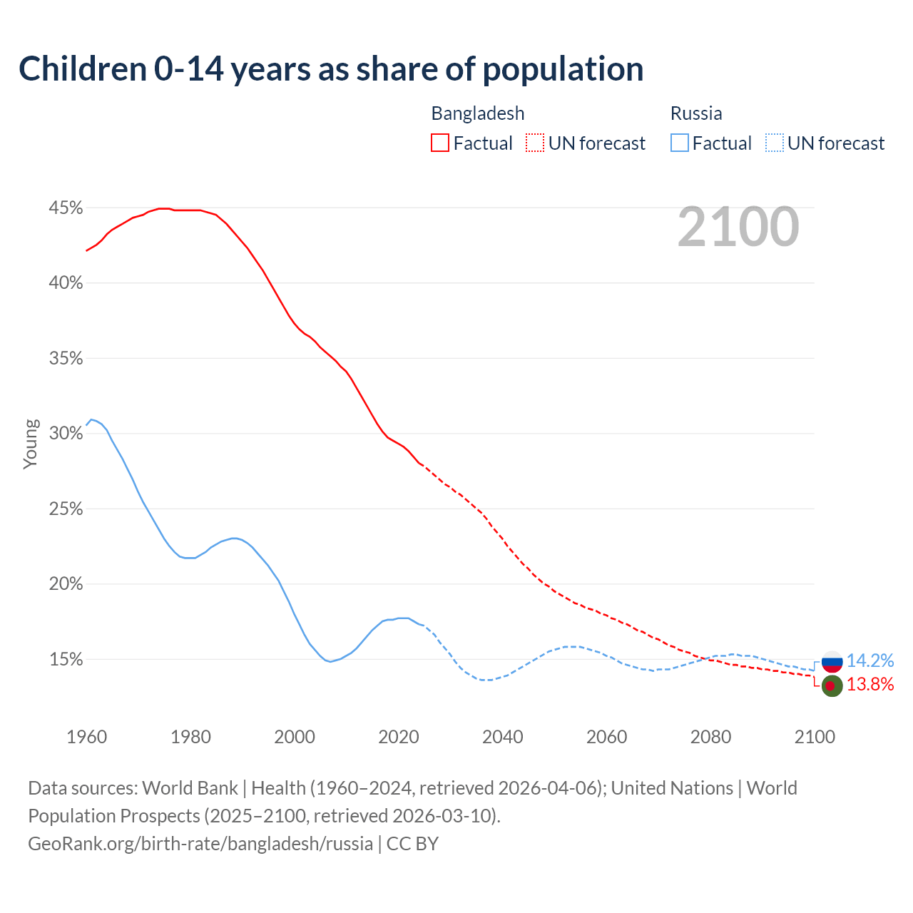 According to the latest available data on birth rates, the fertility rate in Bangladesh was 2.16 children per woman in 2023, compared to 1.41 in Russia in 2023. The replacement level is considered to be 2.1 children per woman.