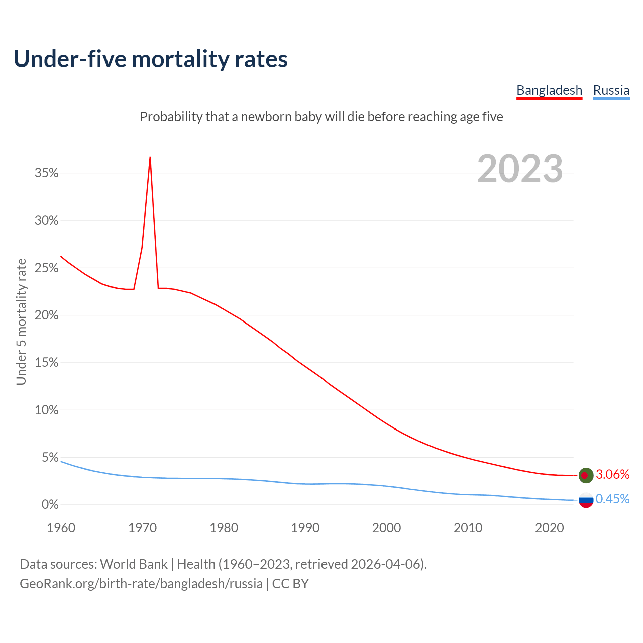 The chance that a newborn baby will die before reaching age five is 3.06% in Bangladesh and 0.45% in Russia. Above is a chart with historical data on under-five mortality rates.