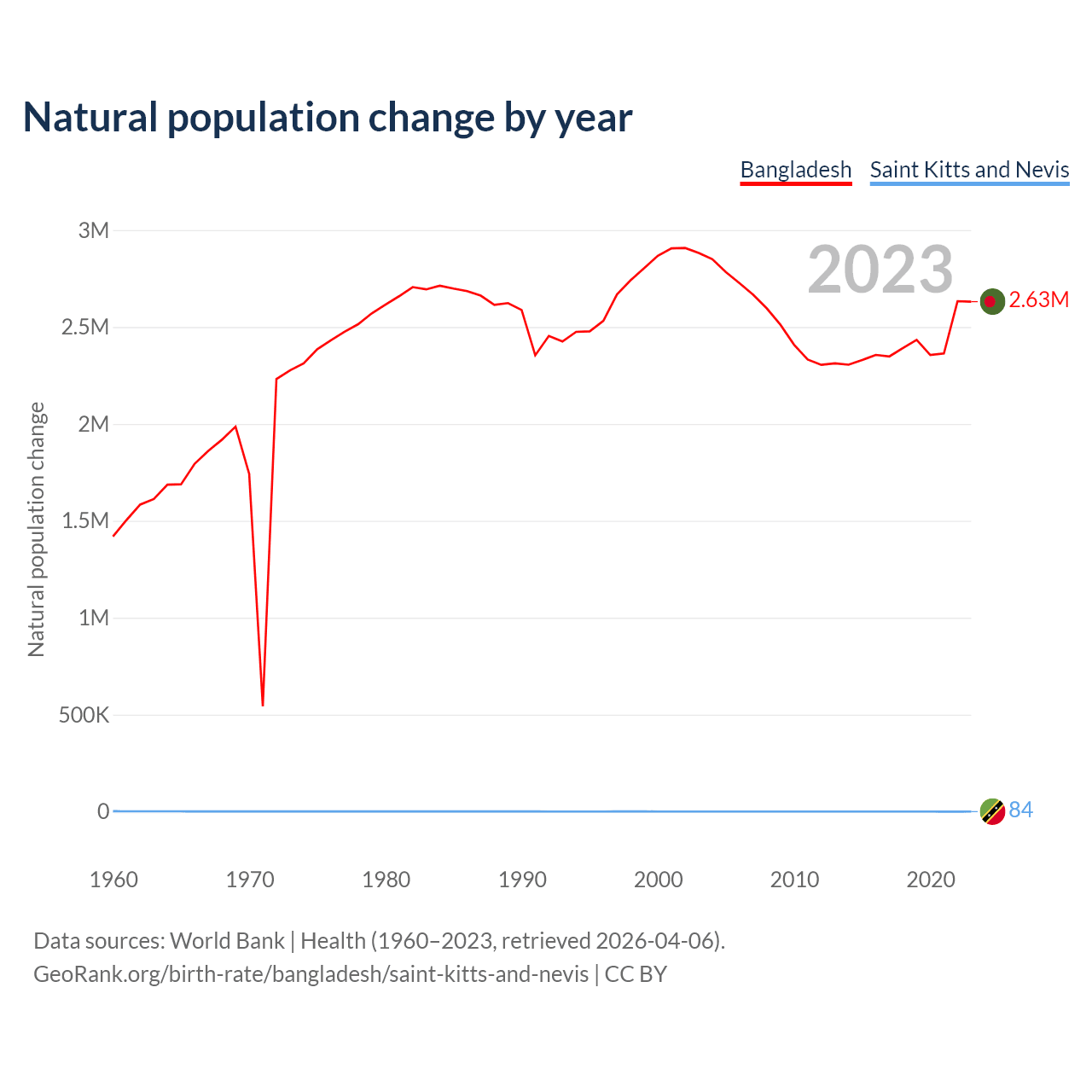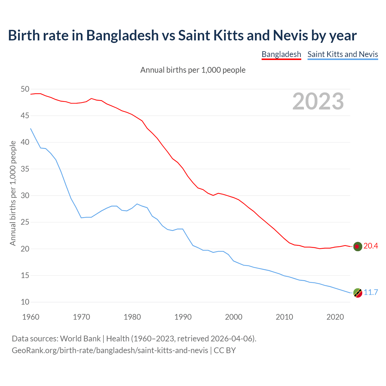 Bangladesh has an annual birth rate of 20.4 births per 1,000 people, compared to 11.7 for Saint Kitts and Nevis. The average number of children a woman is expected to have during her lifetime — the fertility rate, is 2.16 in Bangladesh and 1.51 in Saint Kitts and Nevis — 30.4% difference.
