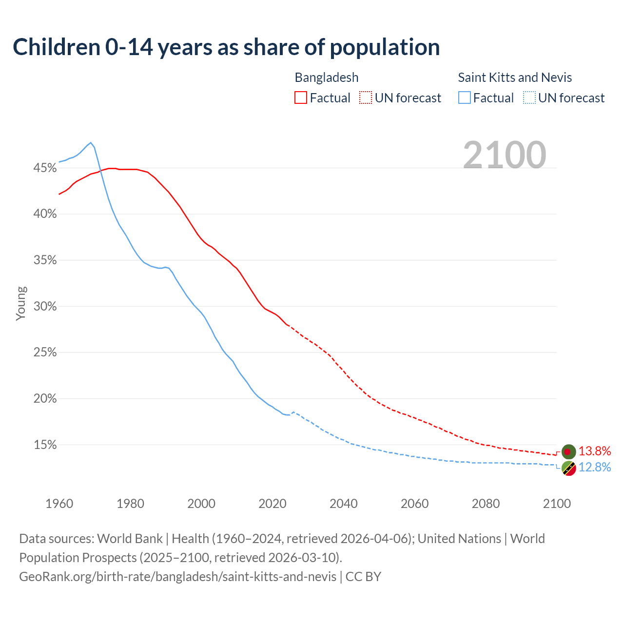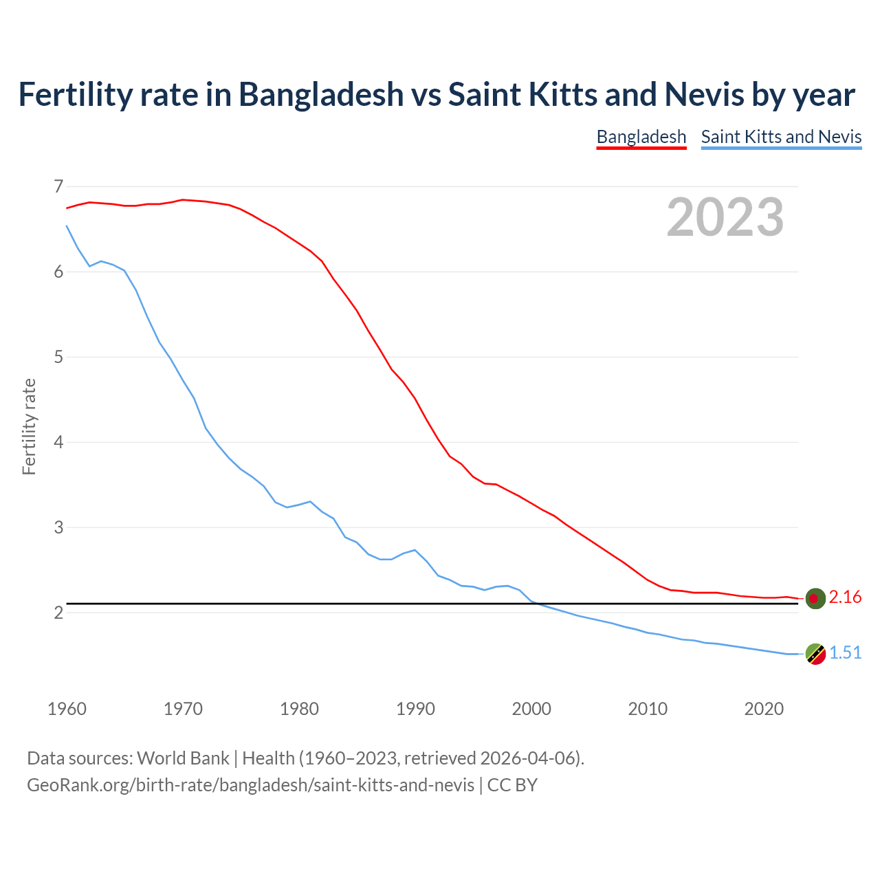 According to the latest available data on birth rates, the fertility rate in Bangladesh was 2.16 children per woman in 2023, compared to 1.51 in Saint Kitts and Nevis in 2023. The replacement level is considered to be 2.1 children per woman.