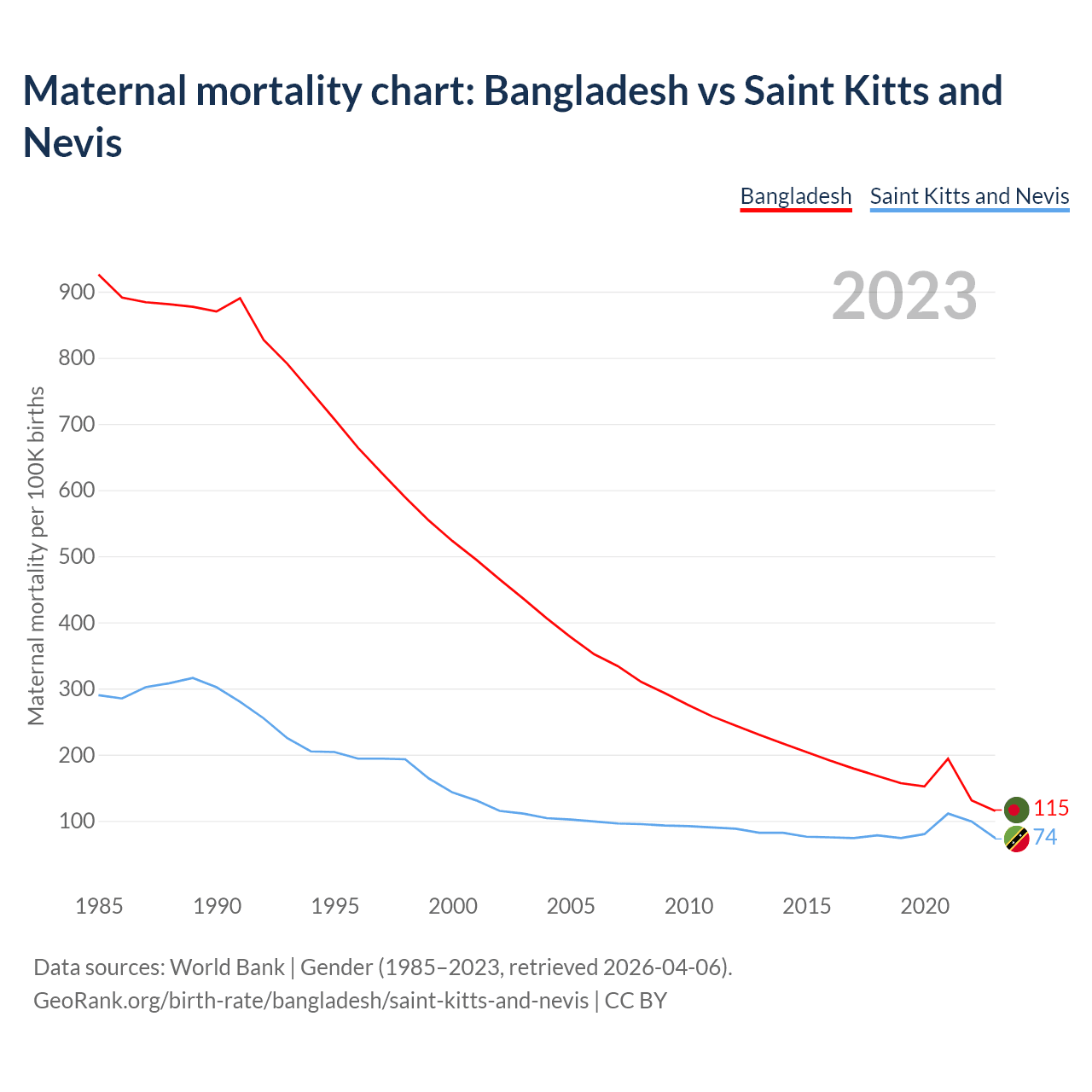 The maternal mortality rate, which is the probability of dying during childbirth or within 42 days of pregnancy termination, is 115 deaths per 100,000 live births in Bangladesh, compared to 74 deaths in Saint Kitts and Nevis.