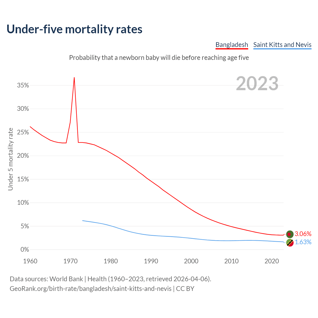 The chance that a newborn baby will die before reaching age five is 3.06% in Bangladesh and 1.63% in Saint Kitts and Nevis. Above is a chart with historical data on under-five mortality rates.