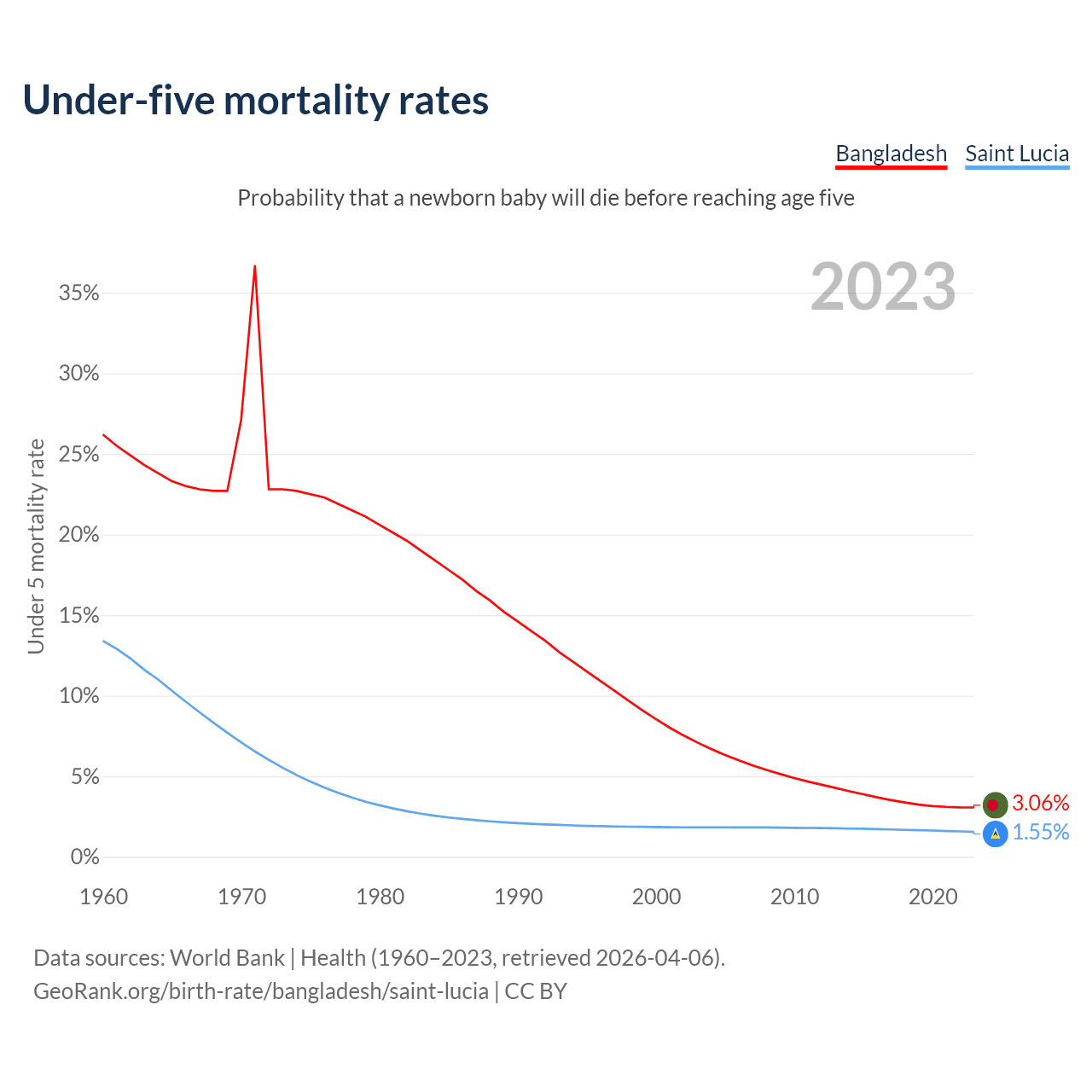 The chance that a newborn baby will die before reaching age five is 3.06% in Bangladesh and 1.55% in Saint Lucia. Above is a chart with historical data on under-five mortality rates.