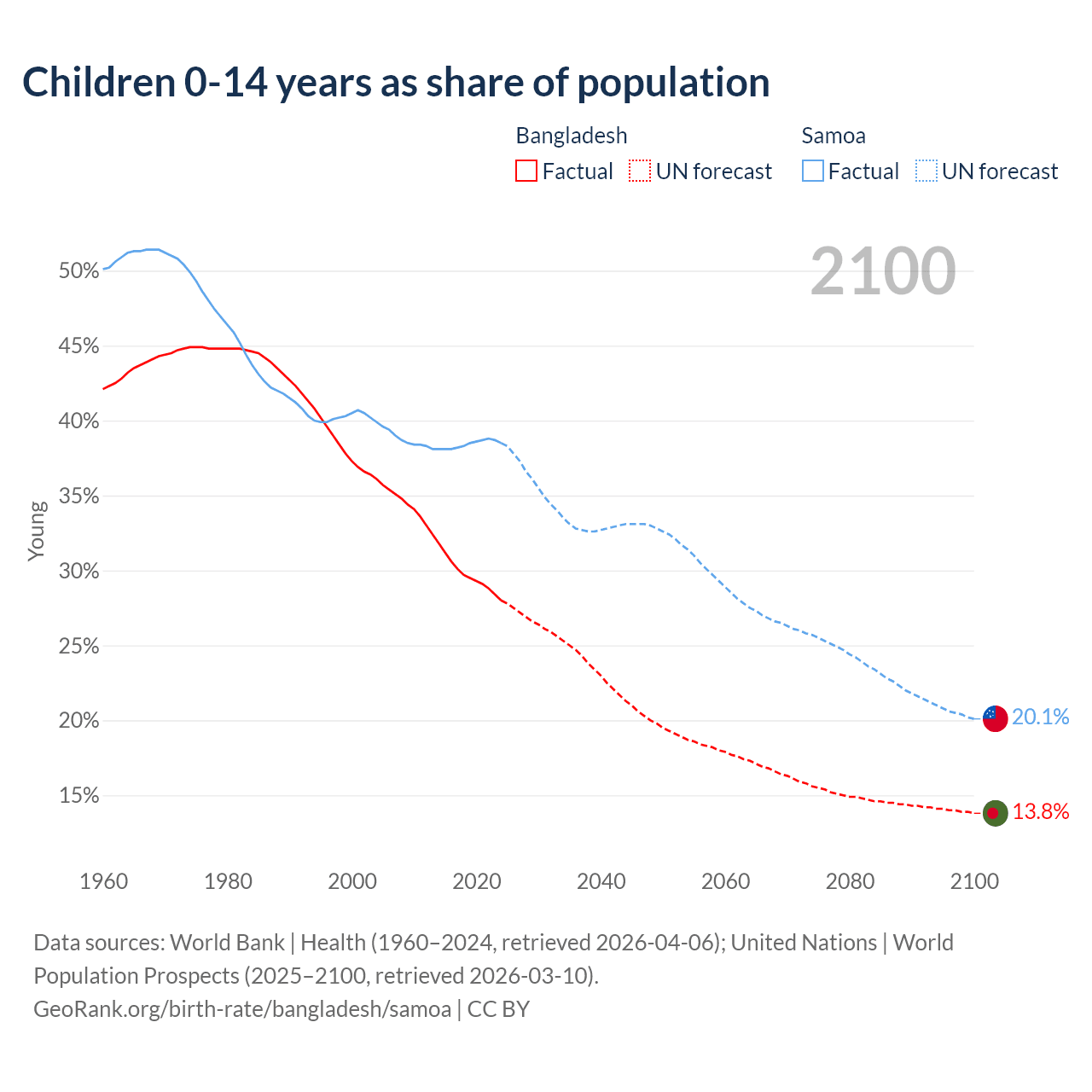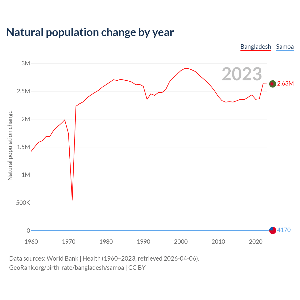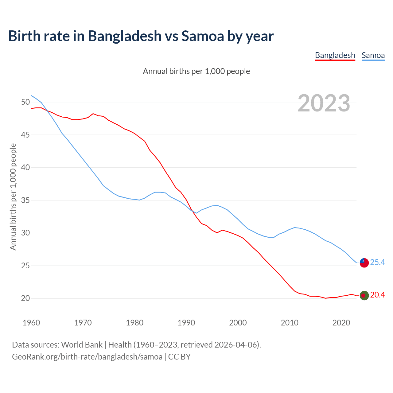 Bangladesh has an annual birth rate of 20.4 births per 1,000 people, compared to 25.4 for Samoa. The average number of children a woman is expected to have during her lifetime — the fertility rate, is 2.16 in Bangladesh and 3.83 in Samoa — 77% difference.