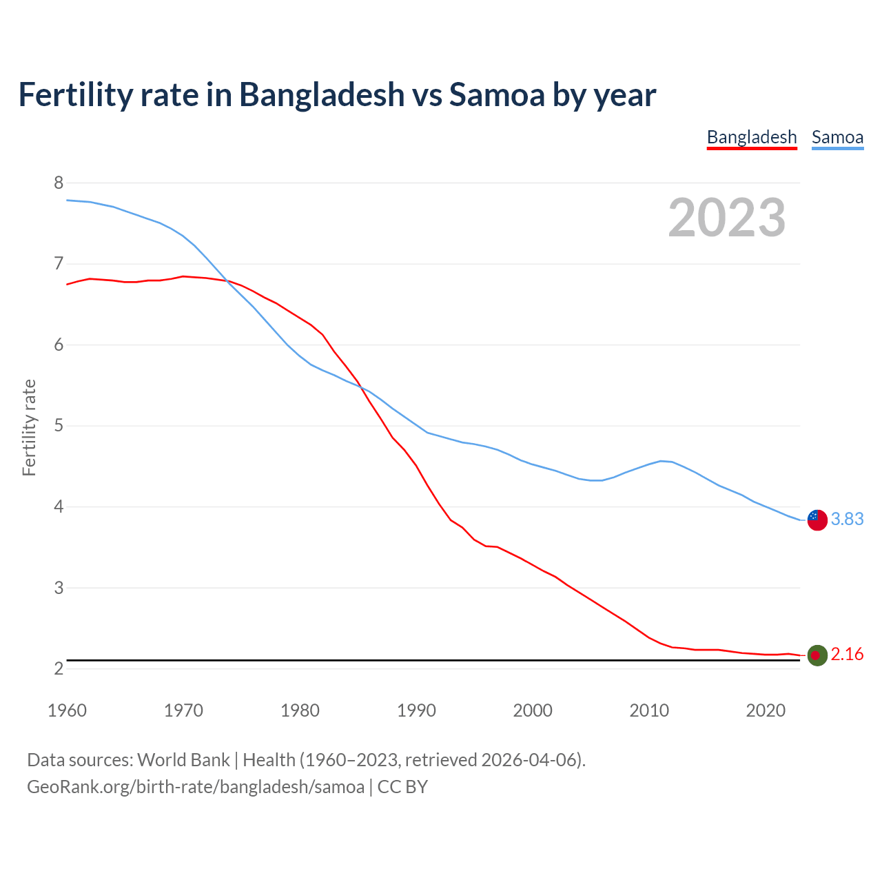 According to the latest available data on birth rates, the fertility rate in Bangladesh was 2.16 children per woman in 2023, compared to 3.83 in Samoa in 2023. The replacement level is considered to be 2.1 children per woman.