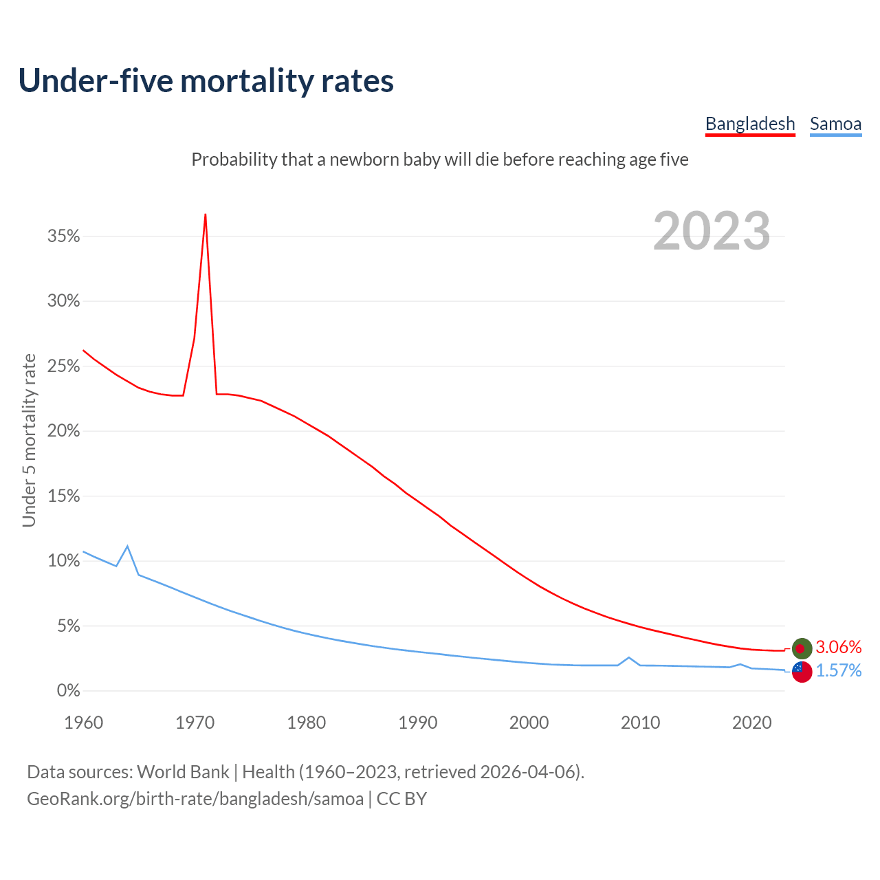 The chance that a newborn baby will die before reaching age five is 3.06% in Bangladesh and 1.57% in Samoa. Above is a chart with historical data on under-five mortality rates.