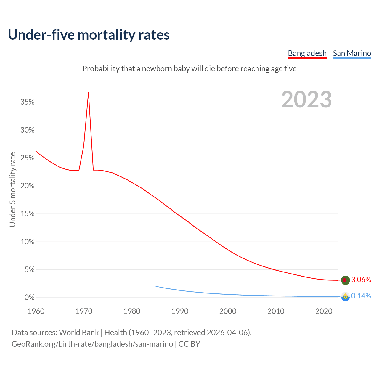 The chance that a newborn baby will die before reaching age five is 3.06% in Bangladesh and 0.14% in San Marino. Above is a chart with historical data on under-five mortality rates.