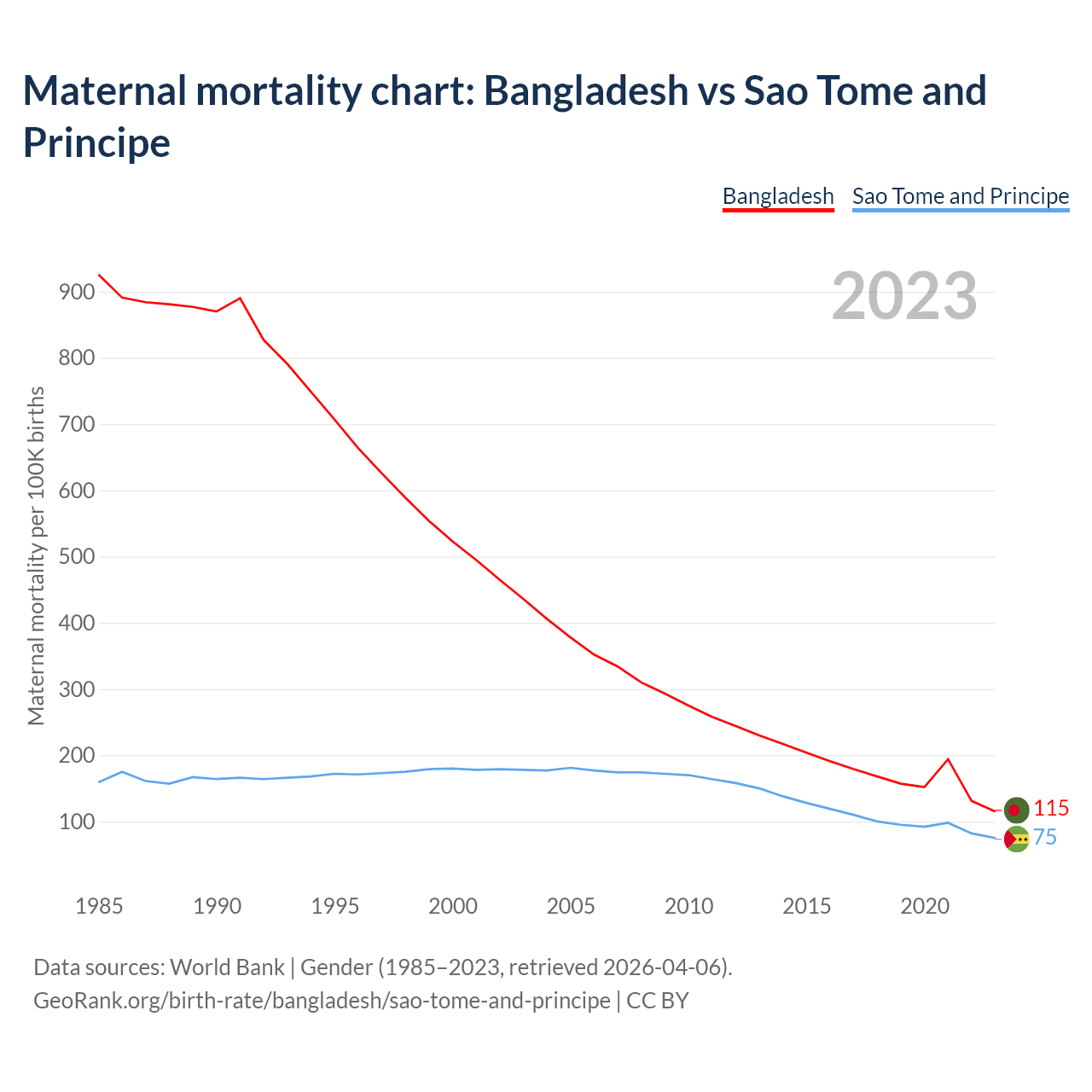 The maternal mortality rate, which is the probability of dying during childbirth or within 42 days of pregnancy termination, is 115 deaths per 100,000 live births in Bangladesh, compared to 75 deaths in Sao Tome and Principe.