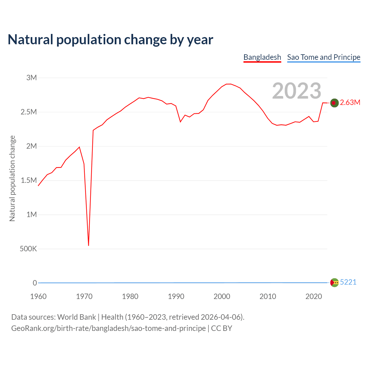 Bangladesh has an annual birth rate of 20.4 births per 1,000 people, compared to 28.2 for Sao Tome and Principe. The average number of children a woman is expected to have during her lifetime — the fertility rate, is 2.16 in Bangladesh and 3.64 in Sao Tome and Principe — 68.5% difference.