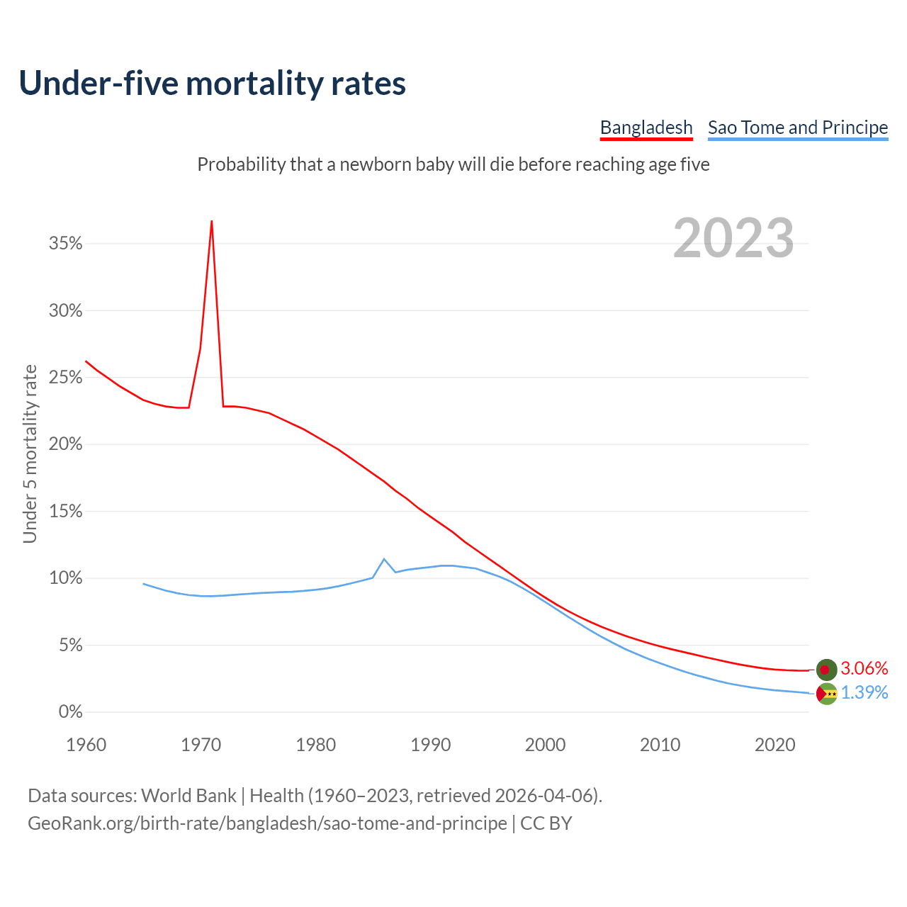 The chance that a newborn baby will die before reaching age five is 3.06% in Bangladesh and 1.39% in Sao Tome and Principe. Above is a chart with historical data on under-five mortality rates.