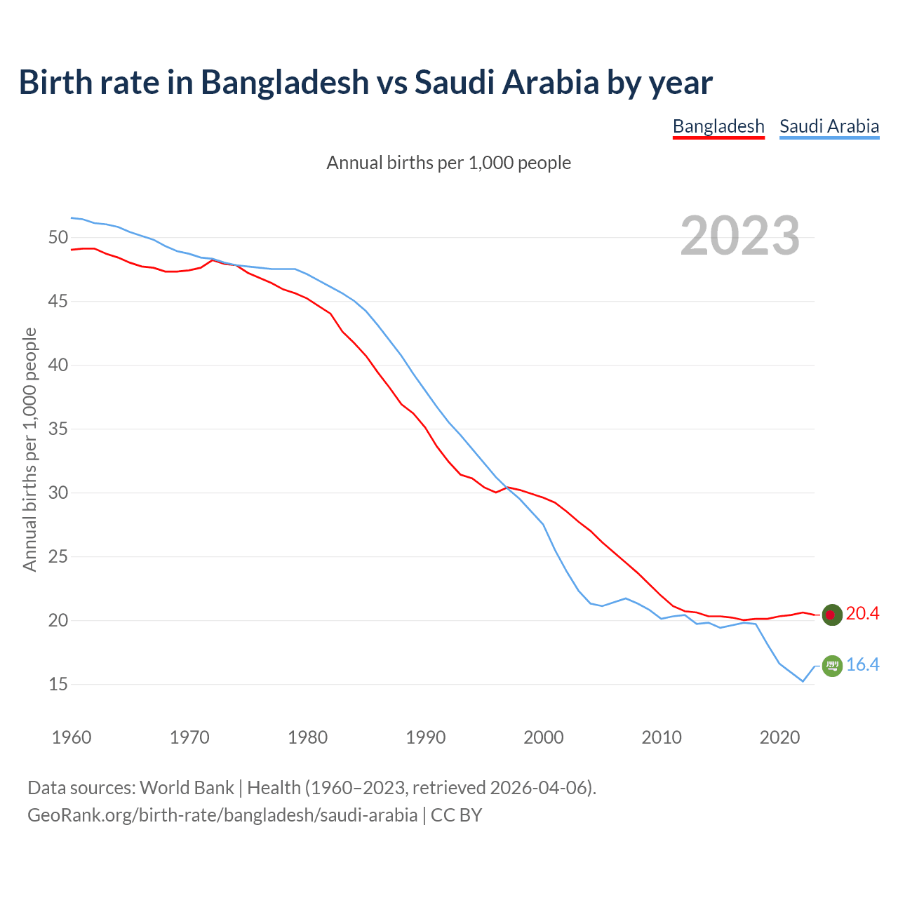 Bangladesh has an annual birth rate of 20.4 births per 1,000 people, compared to 16.4 for Saudi Arabia. The average number of children a woman is expected to have during her lifetime — the fertility rate, is 2.16 in Bangladesh and 2.28 in Saudi Arabia — 5.41% difference.