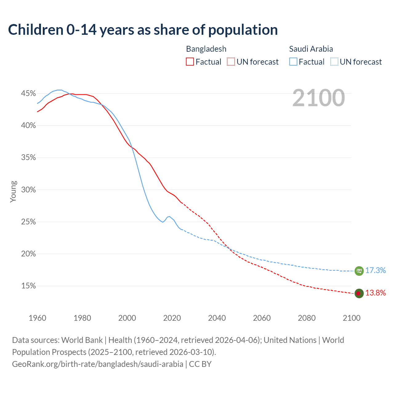 According to the latest available data on birth rates, the fertility rate in Bangladesh was 2.16 children per woman in 2023, compared to 2.28 in Saudi Arabia in 2023. The replacement level is considered to be 2.1 children per woman.