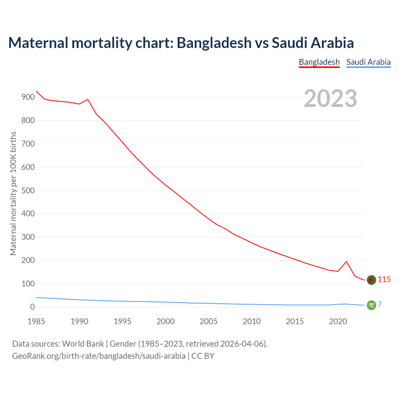 The maternal mortality rate, which is the probability of dying during childbirth or within 42 days of pregnancy termination, is 115 deaths per 100,000 live births in Bangladesh, compared to 7 deaths in Saudi Arabia.