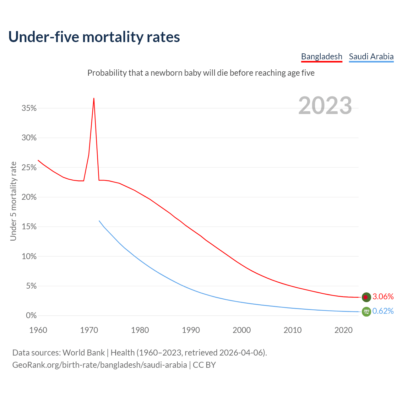 The chance that a newborn baby will die before reaching age five is 3.06% in Bangladesh and 0.62% in Saudi Arabia. Above is a chart with historical data on under-five mortality rates.