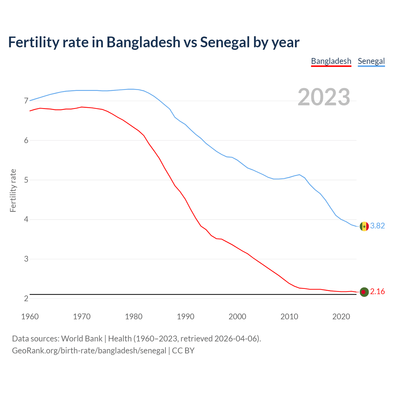 1960 vs 2023, the fertility rate has decreased by 67.9% in Bangladesh and by 45.4% in Senegal — in 1960, it was 6.74 and 7, respectively.