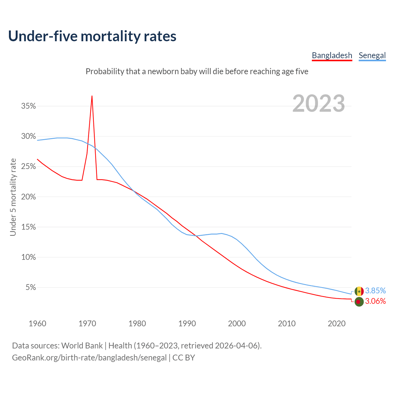 The chance that a newborn baby will die before reaching age five is 3.06% in Bangladesh and 3.85% in Senegal. Above is a chart with historical data on under-five mortality rates.