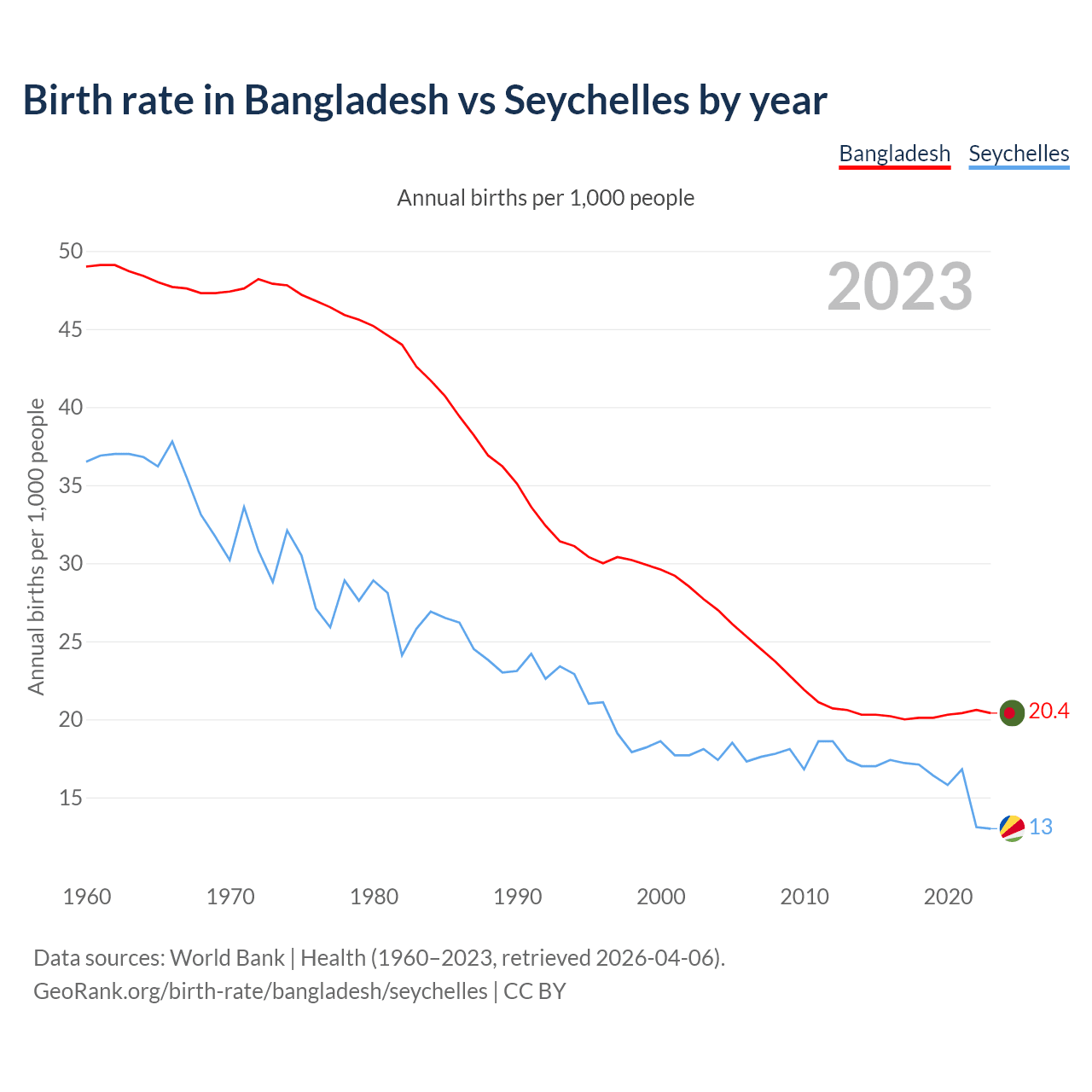 Bangladesh has an annual birth rate of 20.4 births per 1,000 people, compared to 13 for the Seychelles. The average number of children a woman is expected to have during her lifetime — the fertility rate, is 2.16 in Bangladesh and 2.02 in the Seychelles — 6.61% difference.