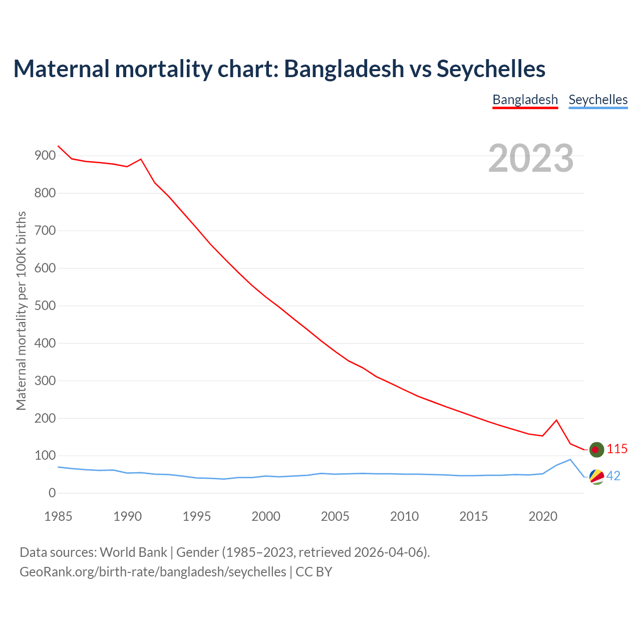 The maternal mortality rate, which is the probability of dying during childbirth or within 42 days of pregnancy termination, is 115 deaths per 100,000 live births in Bangladesh, compared to 42 deaths in the Seychelles.