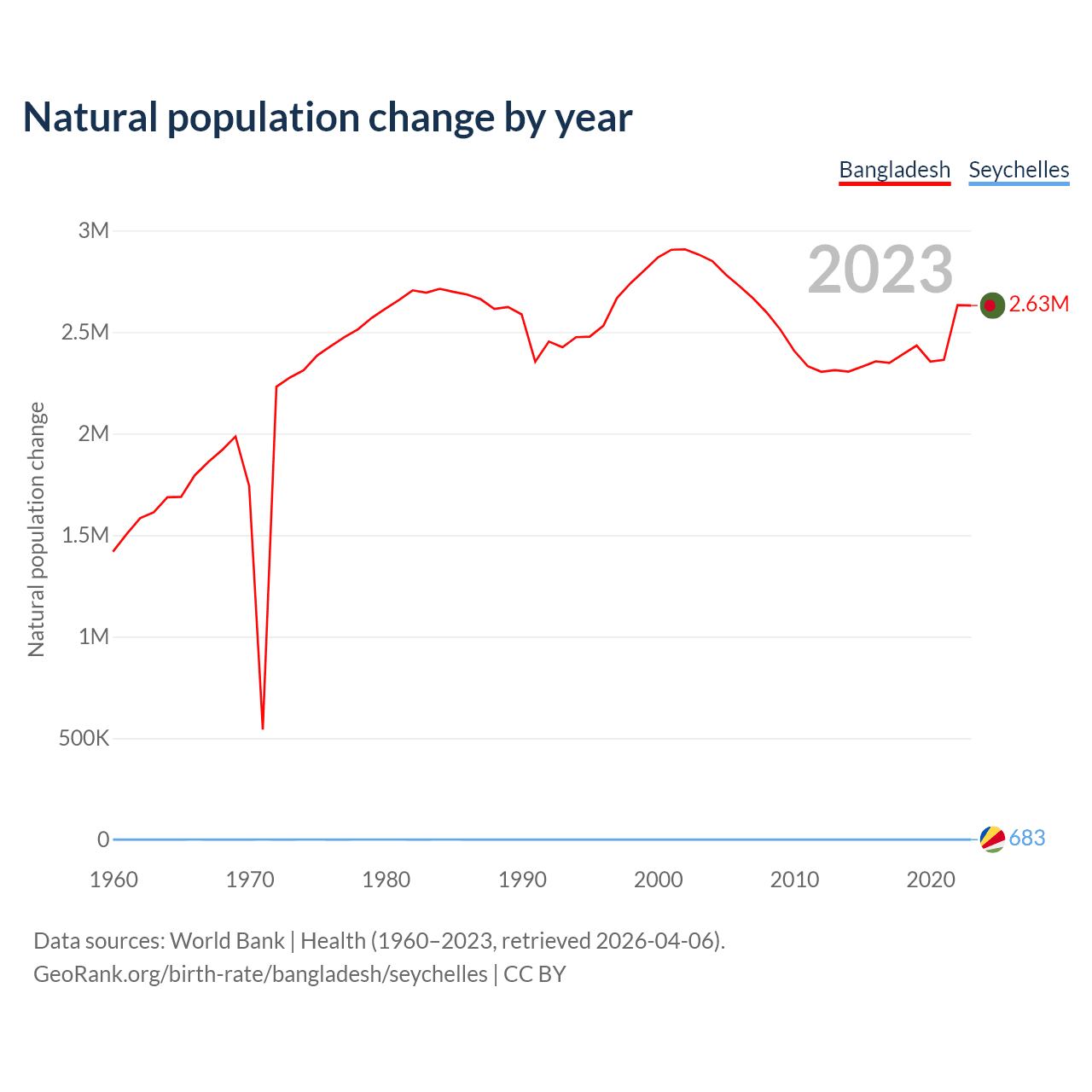 According to the latest available data on birth rates, the fertility rate in Bangladesh was 2.16 children per woman in 2023, compared to 2.02 in the Seychelles in 2023. The replacement level is considered to be 2.1 children per woman.