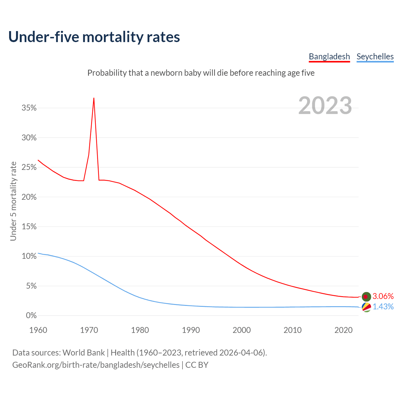 The chance that a newborn baby will die before reaching age five is 3.06% in Bangladesh and 1.43% in the Seychelles. Above is a chart with historical data on under-five mortality rates.