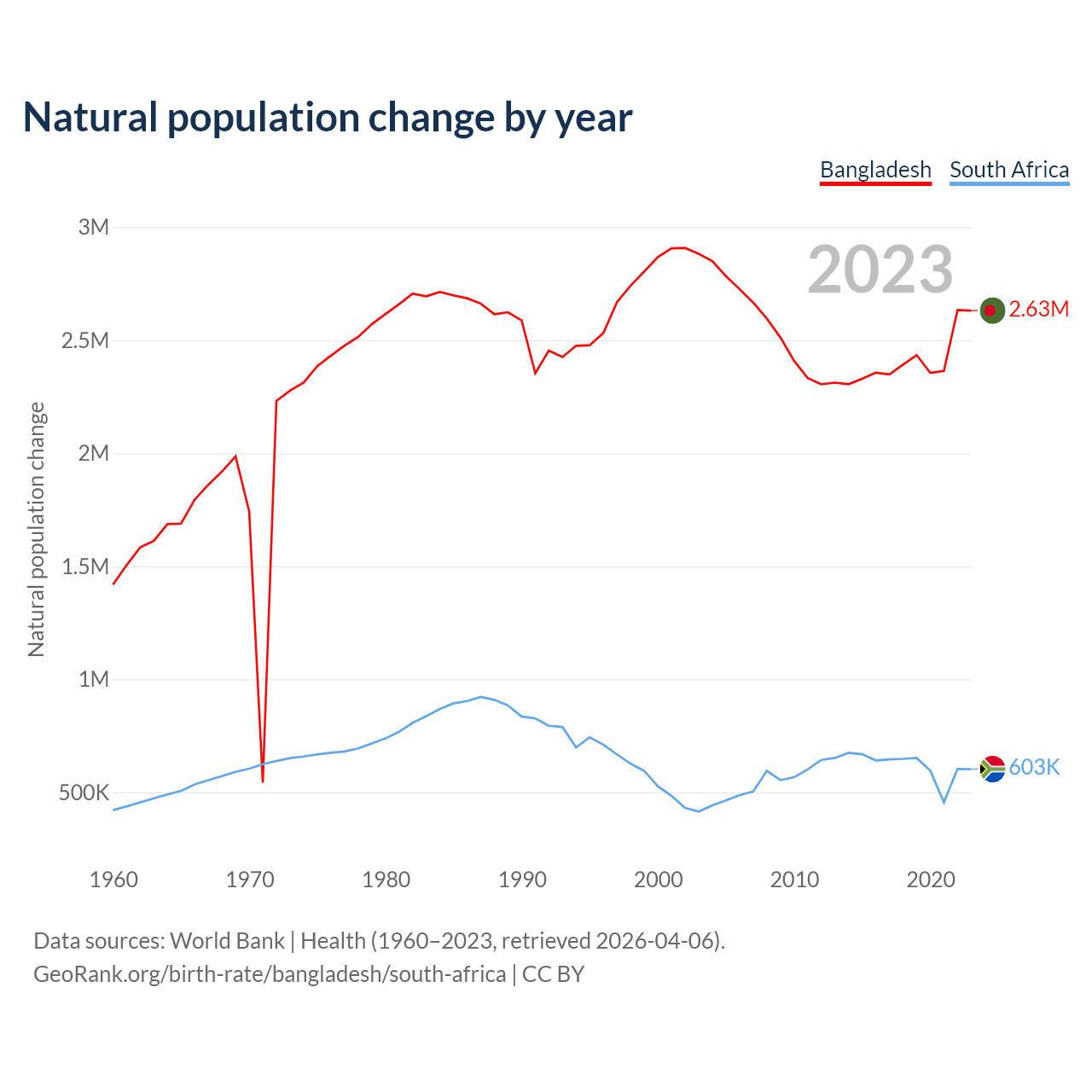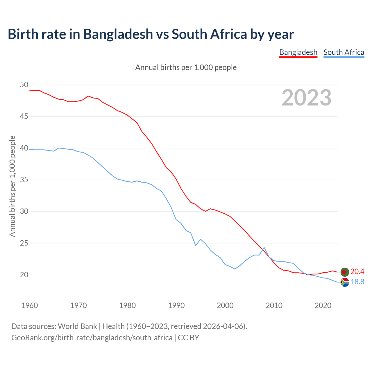 Bangladesh has an annual birth rate of 20.4 births per 1,000 people, compared to 18.8 for South Africa. The average number of children a woman is expected to have during her lifetime — the fertility rate, is 2.16 in Bangladesh and 2.22 in South Africa — 2.45% difference.