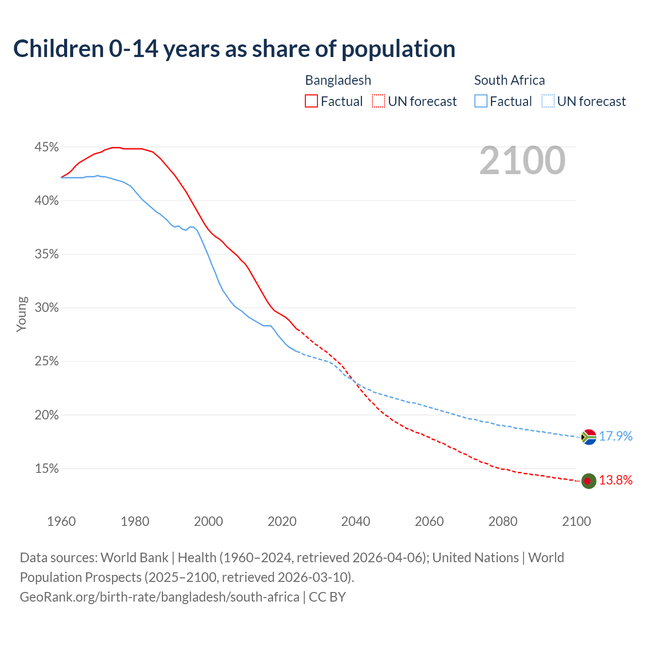 According to the latest available data on birth rates, the fertility rate in Bangladesh was 2.16 children per woman in 2023, compared to 2.22 in South Africa in 2023. The replacement level is considered to be 2.1 children per woman.