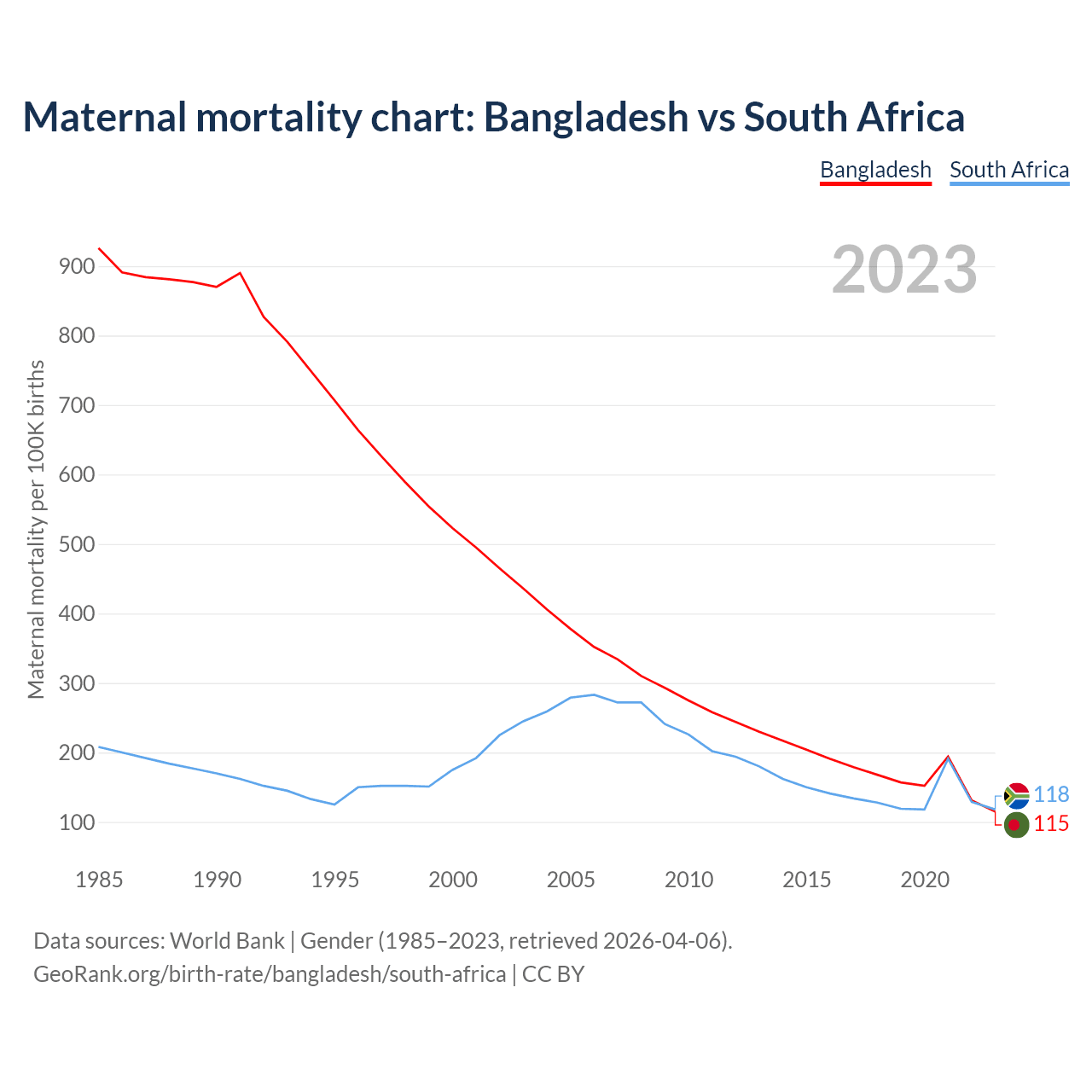 The maternal mortality rate, which is the probability of dying during childbirth or within 42 days of pregnancy termination, is 115 deaths per 100,000 live births in Bangladesh, compared to 118 deaths in South Africa.
