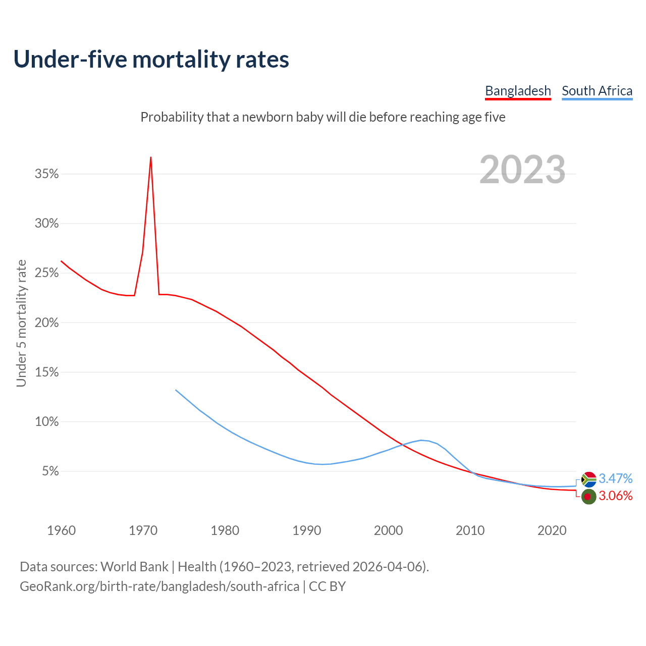 The chance that a newborn baby will die before reaching age five is 3.06% in Bangladesh and 3.47% in South Africa. Above is a chart with historical data on under-five mortality rates.