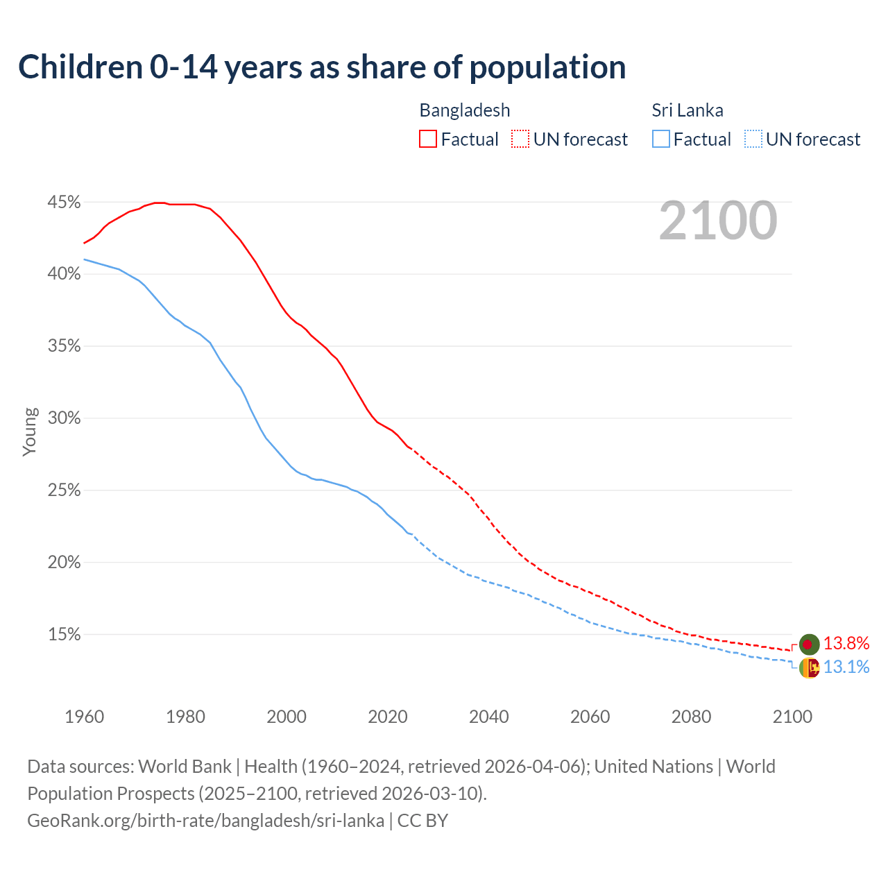 According to the latest available data on birth rates, the fertility rate in Bangladesh was 2.16 children per woman in 2023, compared to 1.97 in Sri Lanka in 2023. The replacement level is considered to be 2.1 children per woman.