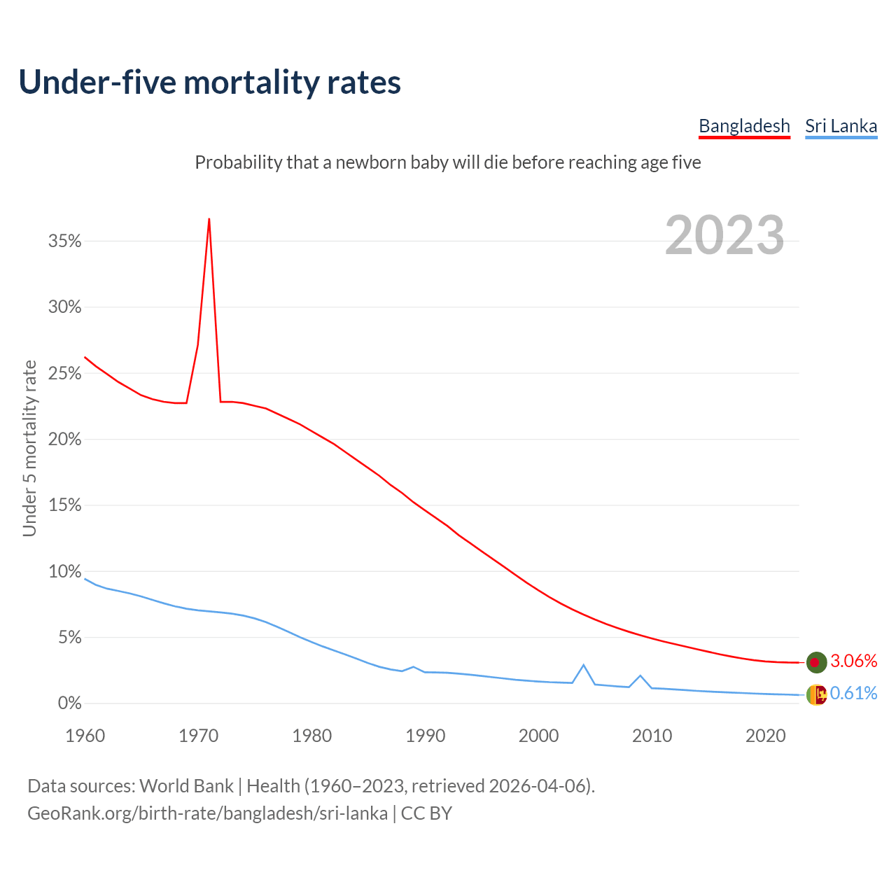 The chance that a newborn baby will die before reaching age five is 3.06% in Bangladesh and 0.61% in Sri Lanka. Above is a chart with historical data on under-five mortality rates.