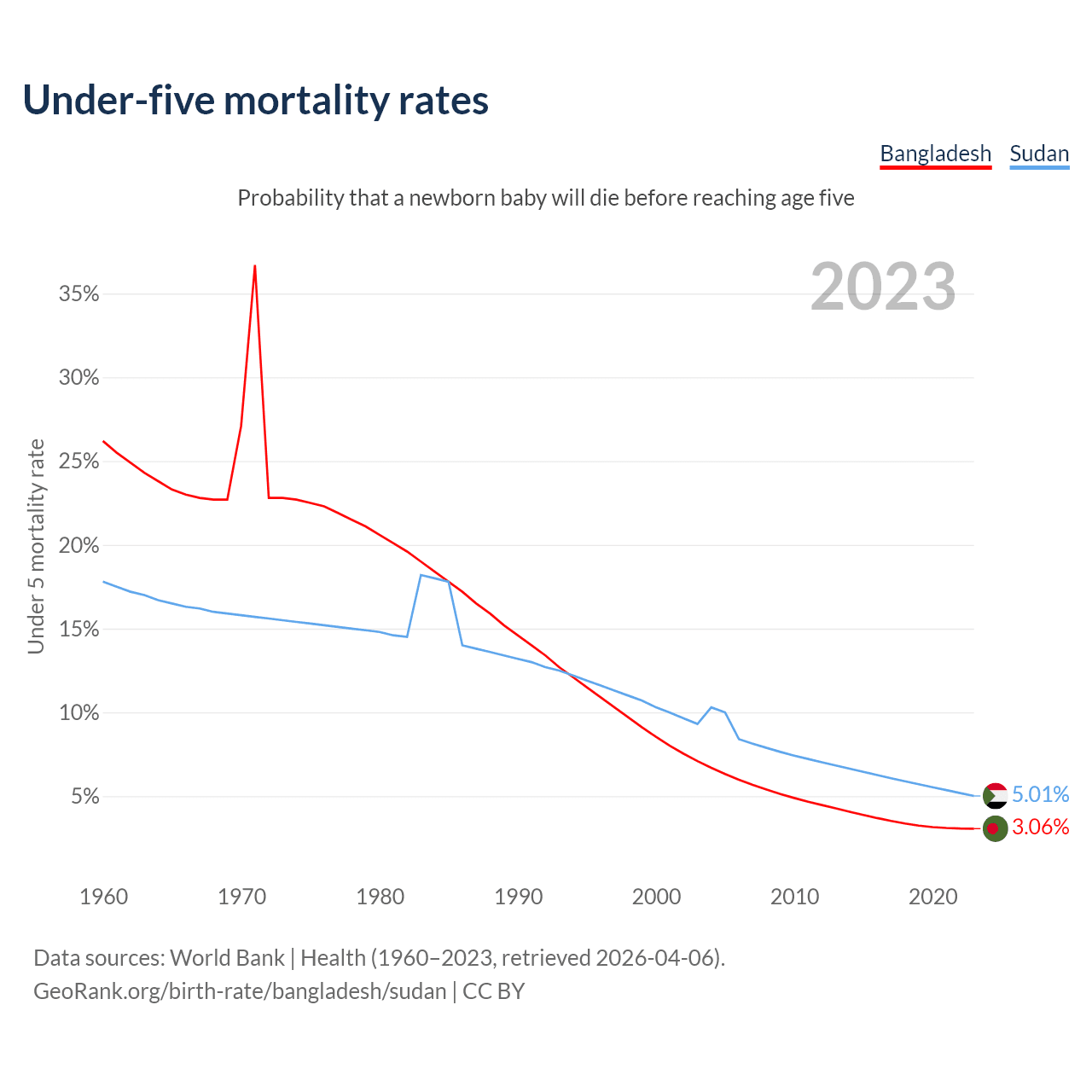 The chance that a newborn baby will die before reaching age five is 3.06% in Bangladesh and 5.01% in Sudan. Above is a chart with historical data on under-five mortality rates.
