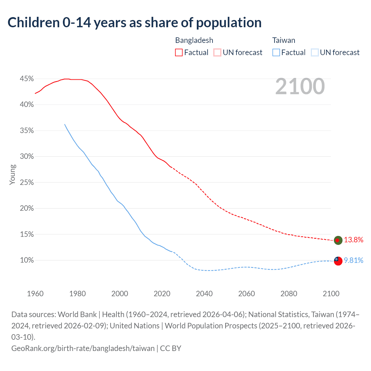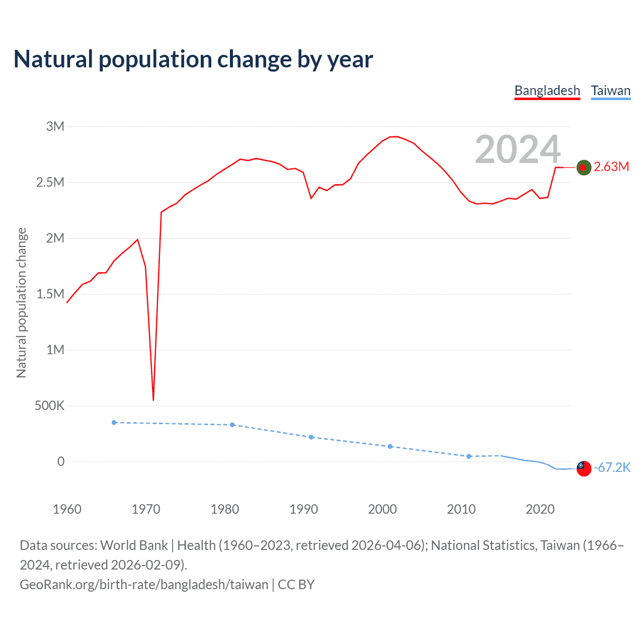 According to the latest available data on birth rates, the fertility rate in Bangladesh was 2.16 children per woman in 2023, compared to 0.89 in Taiwan in 2024. The replacement level is considered to be 2.1 children per woman.