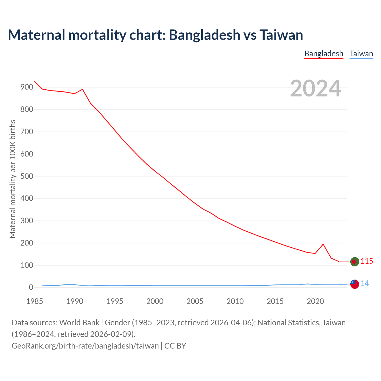 The maternal mortality rate, which is the probability of dying during childbirth or within 42 days of pregnancy termination, is 115 deaths per 100,000 live births in Bangladesh, compared to 14 deaths in Taiwan.