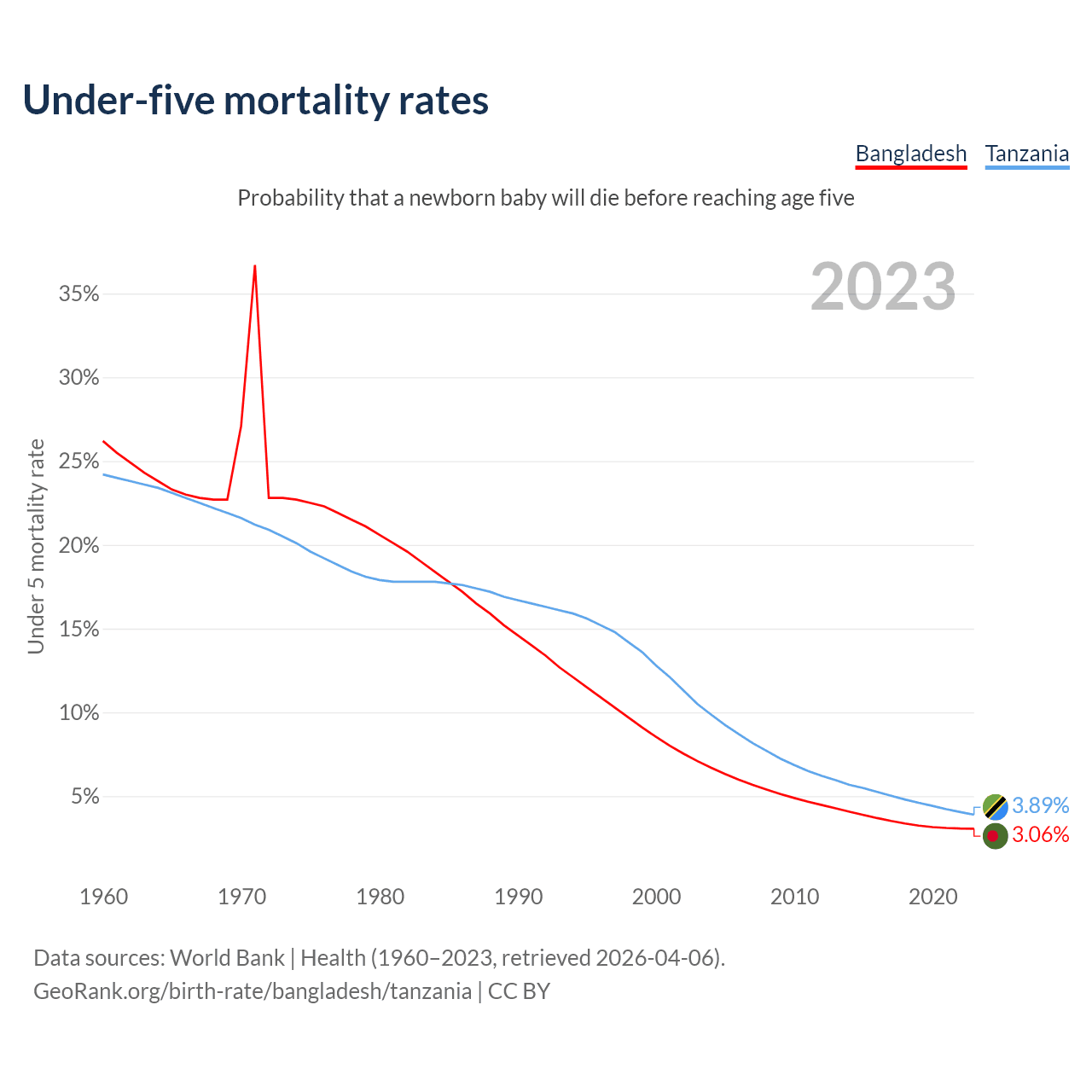 The chance that a newborn baby will die before reaching age five is 3.06% in Bangladesh and 3.89% in Tanzania. Above is a chart with historical data on under-five mortality rates.
