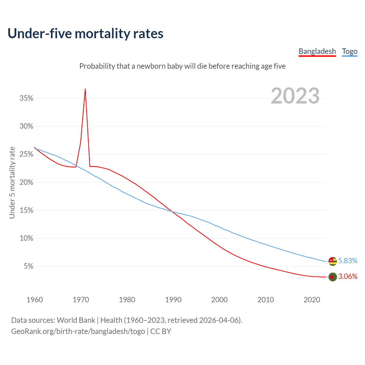 The chance that a newborn baby will die before reaching age five is 3.06% in Bangladesh and 5.83% in Togo. Above is a chart with historical data on under-five mortality rates.