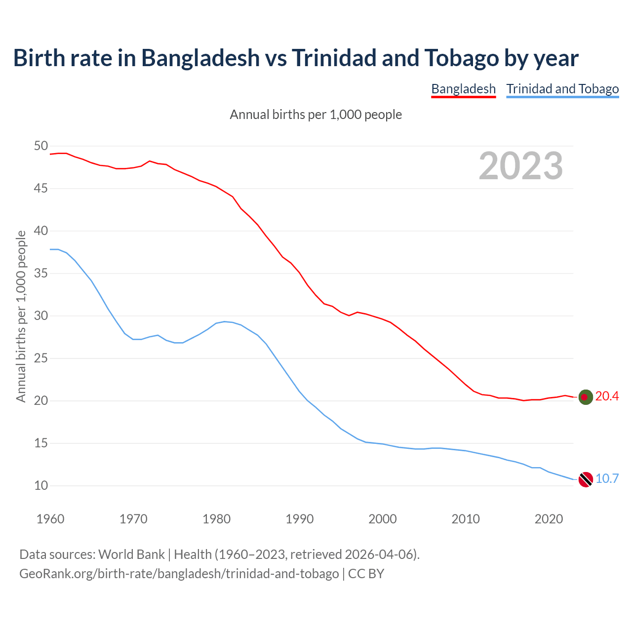 Bangladesh has an annual birth rate of 20.4 births per 1,000 people, compared to 10.7 for Trinidad and Tobago. The average number of children a woman is expected to have during her lifetime — the fertility rate, is 2.16 in Bangladesh and 1.53 in Trinidad and Tobago — 29.2% difference.