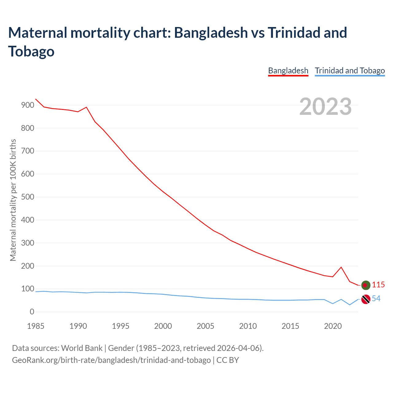 The maternal mortality rate, which is the probability of dying during childbirth or within 42 days of pregnancy termination, is 115 deaths per 100,000 live births in Bangladesh, compared to 54 deaths in Trinidad and Tobago.