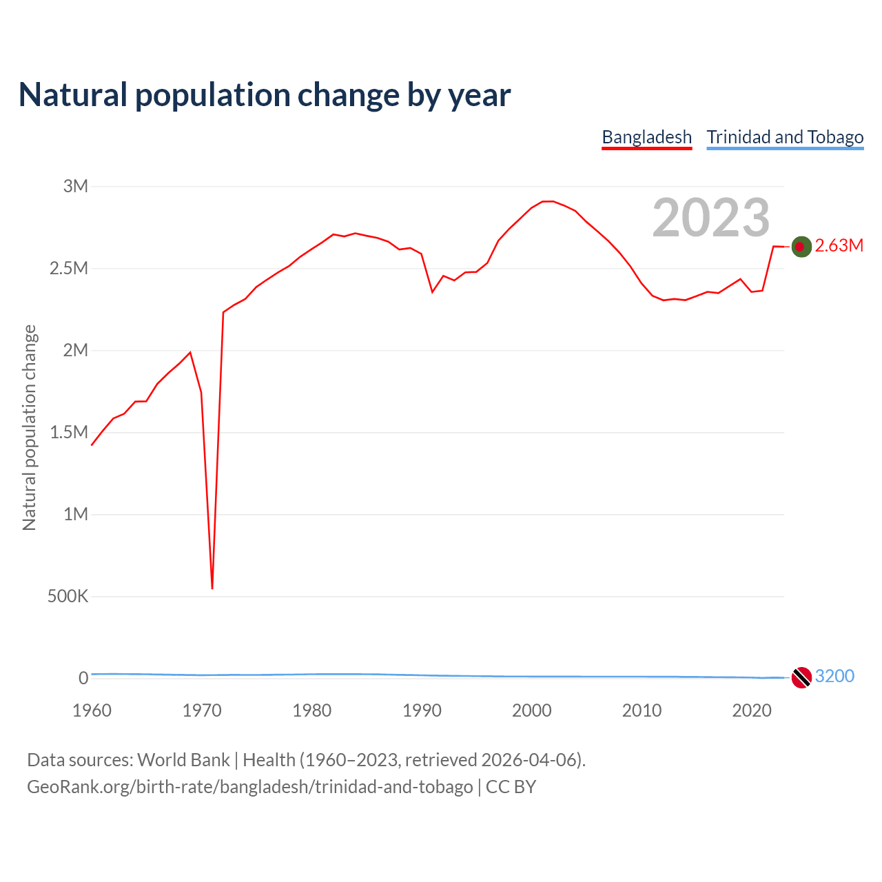 According to the latest available data on birth rates, the fertility rate in Bangladesh was 2.16 children per woman in 2023, compared to 1.53 in Trinidad and Tobago in 2023. The replacement level is considered to be 2.1 children per woman.
