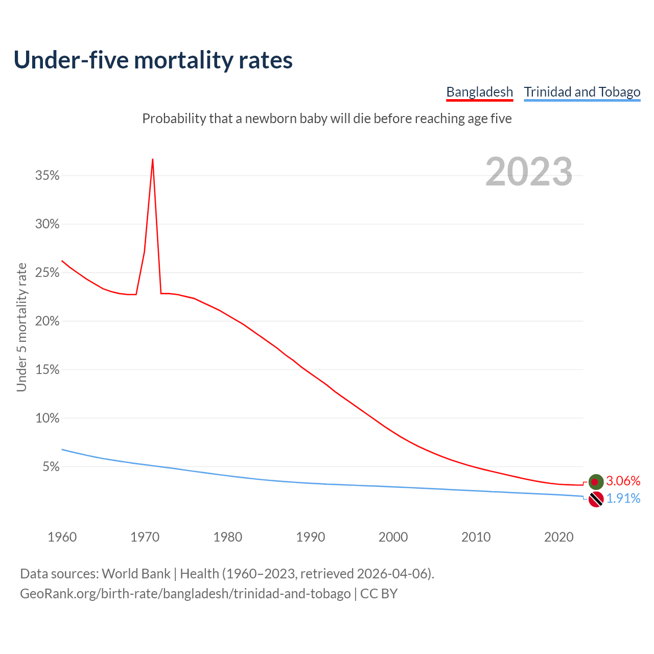 The chance that a newborn baby will die before reaching age five is 3.06% in Bangladesh and 1.91% in Trinidad and Tobago. Above is a chart with historical data on under-five mortality rates.